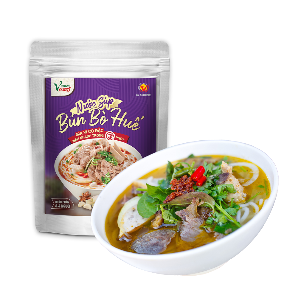 “Nước súp Bún Bò Huế, gia vị cô đặc ViancoFoods, chuẩn vị trong 3 phút” là sự kết hợp hòa quyện giữa các loại gia vị tạo nên hương vị bún bò chuẩn vị. Giúp việc nấu trở nên dễ dàng hơn nhưng vẫn đạt được độ chuẩn vị hoàn hảo.