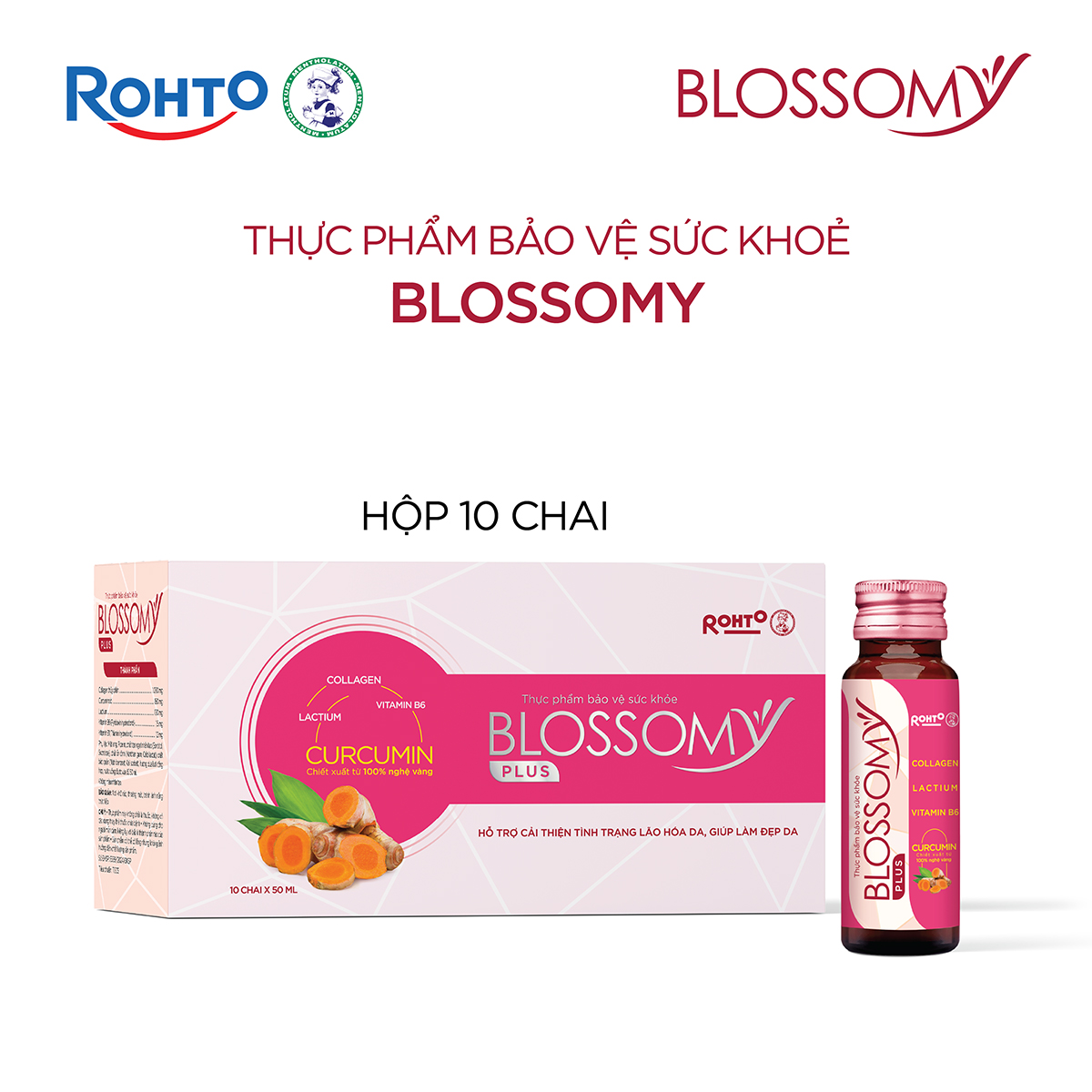 Mua tại TiktokThực phẩm bảo vệ sức khỏe giúp da sáng đẹp và dạ dày khỏe Blossomy lốc 10 chai x 50ml Nước uống collagen giúp sáng da, dạ dày khỏe Blossomy là là thực phẩm bảo vệ sức khỏe, phối hợp Curcumin tự nhiên từ nghệ vàng với Collagen cùng các chất Lactium, Vitamin B1, Vitamin B6 và Mật Ong hình thành nên công thức giúp da sáng đẹp, căng mịn, trẻ trung và làm lành giảm viêm loét dạ dày. Thành phần: Curcumin tự nhiên, Collagen, Lactium, vitamin B1, vitamin B6, mật ong Curcuminoid 150 mg, Lactium 100 mg, Collagen 50 mg, Vitamin B6 1,5 mg, Vitamin B1 1,2 mg, Mật ong, Piperin, Chất tạo ngọt nhân tạo (420(i), 951), Chất ổn định (415, 327), Chất bảo quản (211, 202), Hương dưa lưới tổng hợp, Nước uống được vừa đủ 50 ml Công dụng: