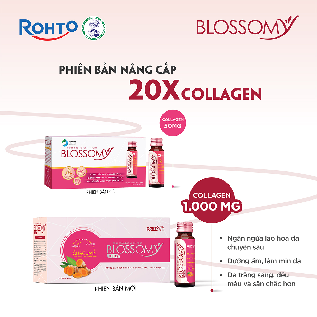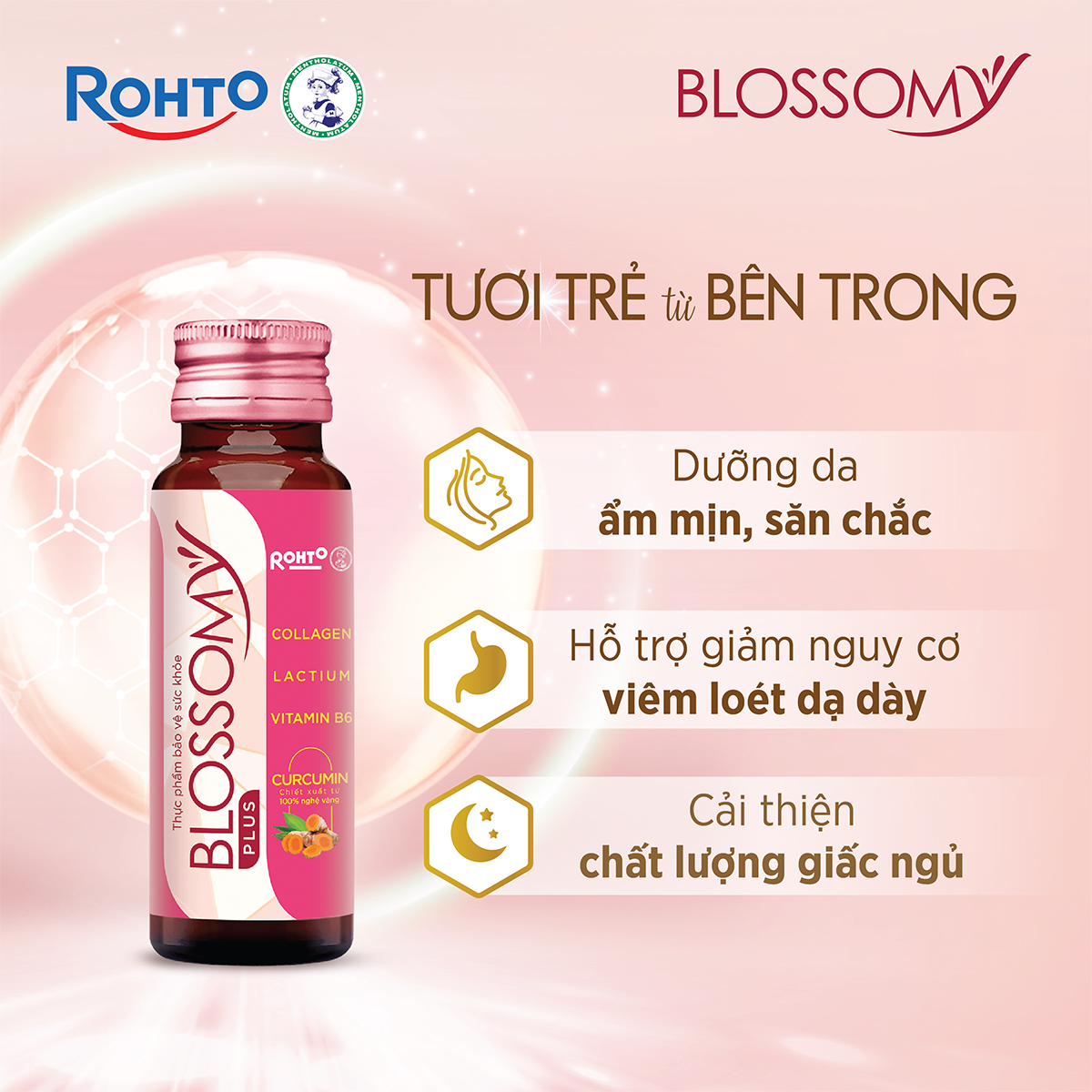 - Nước uống collagen giúp sáng da, dạ dày khỏe Blossomy Curcumin Tươi Trẻ Từ Bên Trong 50ml bổ sung collagen và curcumin giúp làn da luôn tươi trẻ.