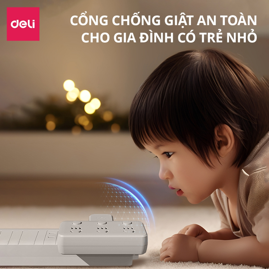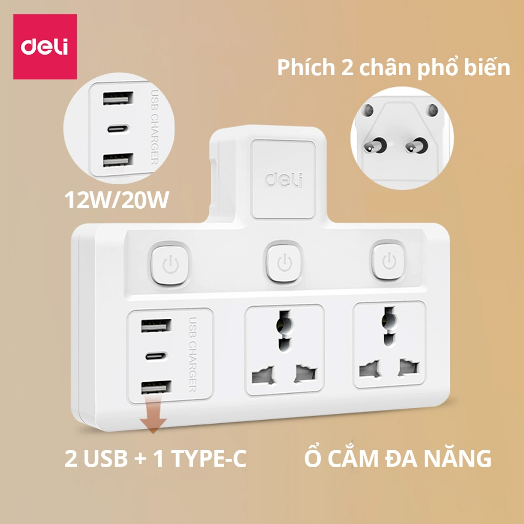 Ổ CHIA ĐIỆN ĐA NĂNG DELI TÍCH HỢP USB & TYPE-C SẠC NHANH   Điểm Nổi Bật: Thiết Kế Thông Minh, Đa Dụng: Các phiên bản ET714, ET715, ET716, ET717 đều được thiết kế nhỏ gọn, tiện lợi, với từ 2 đến 3 ổ cắm cùng cổng USB và Type-C hỗ trợ sạc nhanh, giúp bạn sử dụng nhiều thiết bị cùng lúc. Tích Hợp Cổng Sạc Hiện Đại: Sản phẩm có tích hợp USB và Type-C sạc nhanh, sạc ngay các thiết bị di động mà không cần củ sạc, tiện lợi khi sử dụng. An Toàn Tuyệt Đối: Chất liệu nhựa PP chống cháy, chịu nhiệt lên đến 750 độ C, kèm nút nguồn giúp kiểm soát điện dễ dàng, tránh nguy cơ cháy nổ.   Thông Số Kỹ Thuật: ET714: Công suất tối đa: 2500W Số ổ cắm: 2 ổ cắm, 1 nút nguồn Chất liệu: Nhựa PP chịu nhiệt 750°C Kích thước: 93.5 x 108 x 51mm   ET715: Công suất tối đa: 2500W Số ổ cắm: 3 ổ cắm, 3 nút nguồn Chất liệu: Nhựa PP chịu nhiệt 750°C Kích thước: 162 x 120 x 51.7mm   ET716: Cổng sạc: 2 USB + 1 Type-C (12W) Công suất tối đa: 2500W Số ổ cắm: 2 ổ cắm Chất liệu: Nhựa PP chịu nhiệt 750°C Kích thước: 162 x 120 x 51.7mm   ET717: Cổng sạc: 2 USB + 1 Type-C (Sạc nhanh 20W) Công suất tối đa: 2500W Số ổ cắm: 2 ổ cắm Chất liệu: Nhựa PP chịu nhiệt 750°C Kích thước: 162 x 120 x 51.7mm   Lợi Ích Khi Sử Dụng: Nhỏ Gọn - Đa Năng: Dễ dàng mang theo khi di chuyển, không chiếm không gian trong túi hay bàn làm việc. Cung cấp đủ nguồn điện cho nhiều thiết bị cùng lúc. Tiện Lợi Mọi Lúc: Với cổng USB/Type-C tích hợp, bạn sẽ không cần mang theo củ sạc nữa, giúp tiết kiệm thời gian sạc nhanh chóng. An Tâm Sử Dụng: Chất liệu nhựa PP cao cấp chống cháy, lõi dây đồng giúp ổn định dòng điện, tránh chập mạch, bảo vệ thiết bị điện của bạn.