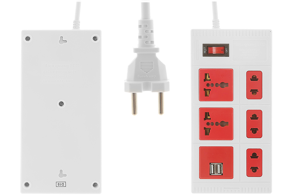 Ổ cắm điện Điện Quang 5 lỗ gồm: 2 lỗ 3 chấu, 3 lỗ 2 chấu