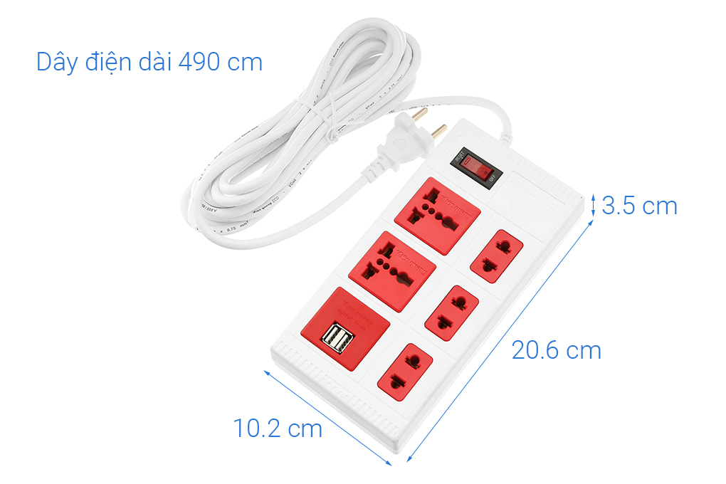 Chú ý: Độ dài dây điện nếu tính từ phích cắm đến dây đồng đi bên trong từng lỗ cắm là 5m, nếu tính từ phích cắm đến đầu ổ cắm là 4.9m.
