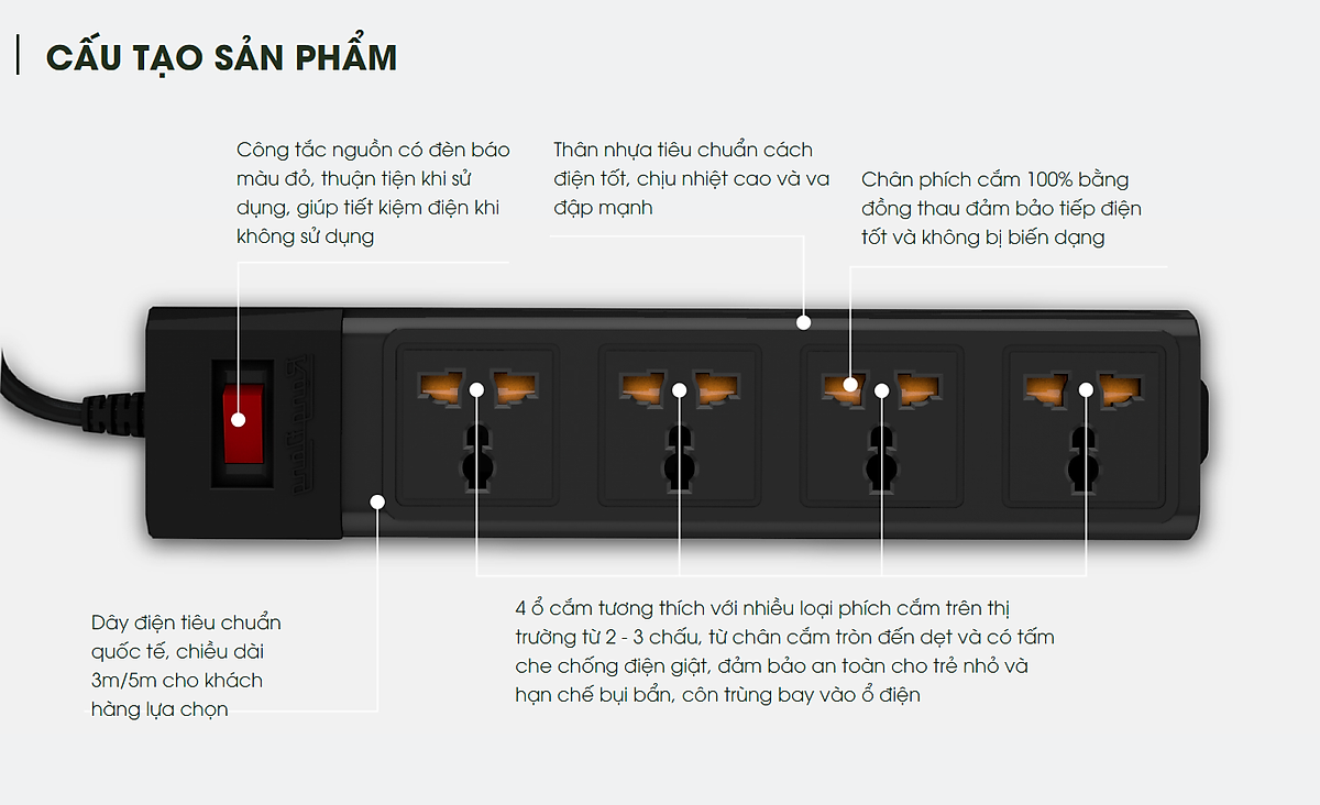 - Ổ cắm đa năng sử dụng đồng chuyên dụng siêu đàn hồi.