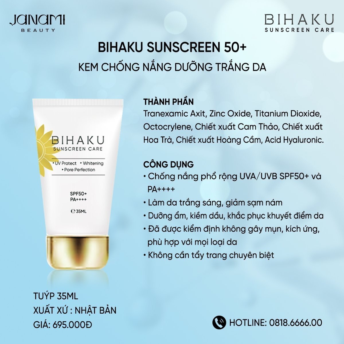 Kem chống nắng Bihaku Sunscreen Care có thành phần chống nắng vật lý lai hóa học giúp chống nắng bảo vệ da khỏi UVA/UVB một cách toàn diện (SPF 50+, PA++++) và hạn chế tối đa vấn đề về cháy nắng.