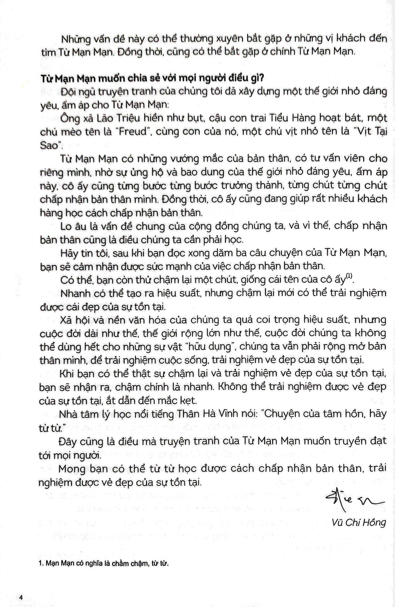 Mua tại TiktokÔm Lấy Bản Thân Tuyệt Vời CUỐN SÁCH VỚI ĐẦY NHỮNG CÂU CHUYỆN VÀ MINH HỌA DỄ THƯƠNG NÀY SẼ LÀ CÔNG CỤ ĐẮC LỰC GIÚP BẠN CHẤP NHẬN BẢN THÂN! Tôi tên Từ Mạn Mạn, là một nhà tư vấn tâm lý giúp bạn chữa lành cảm xúc và chấp nhận bản thân. Tôi muốn mời bạn cùng tôi luyện tập một động tác: Giơ hai tay, bắt tréo nhau ôm lấy chính m.ình, vỗ vỗ lên vai, sau đó tự nhủ: "Trong quá khứ, m.ình đã làm rất giỏi rồi. Phần còn lại, m.ình thật sự có thể từ từ làm."