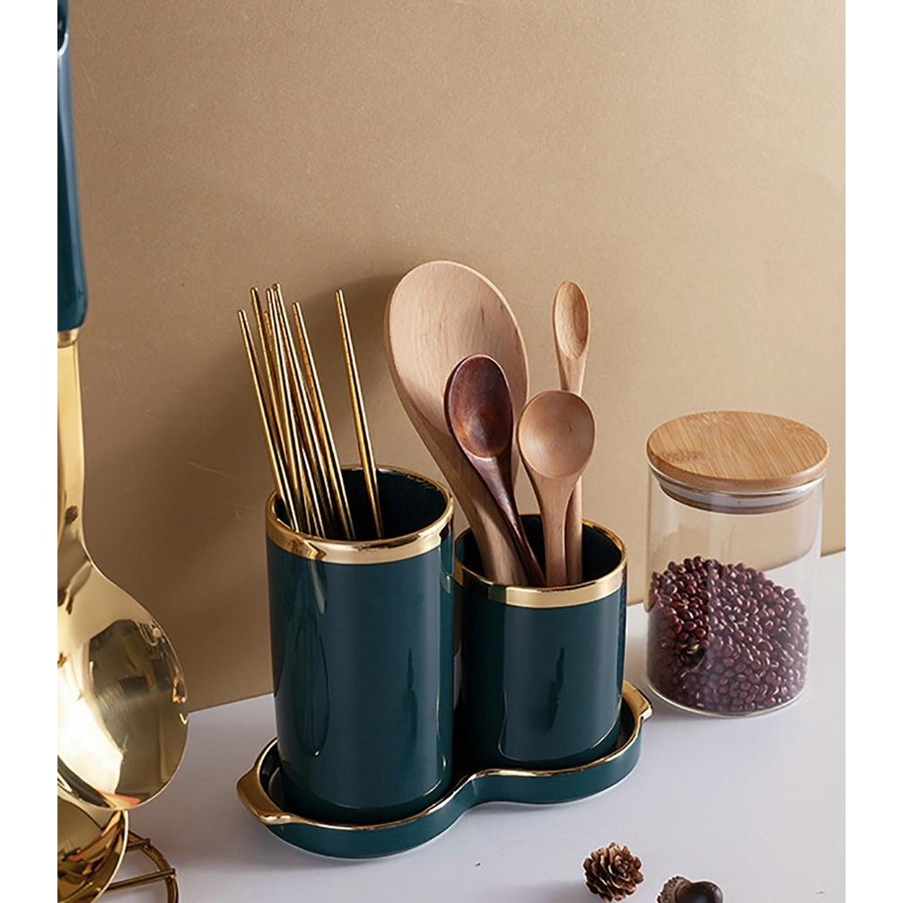 ✨ỐNG ĐỰNG THÌA ĐŨA ĐÔI KHÈM KHAY BẰNG SỨ VIỀN VÀNG PHONG CÁCH BẮC ÂU SANG TRỌNG