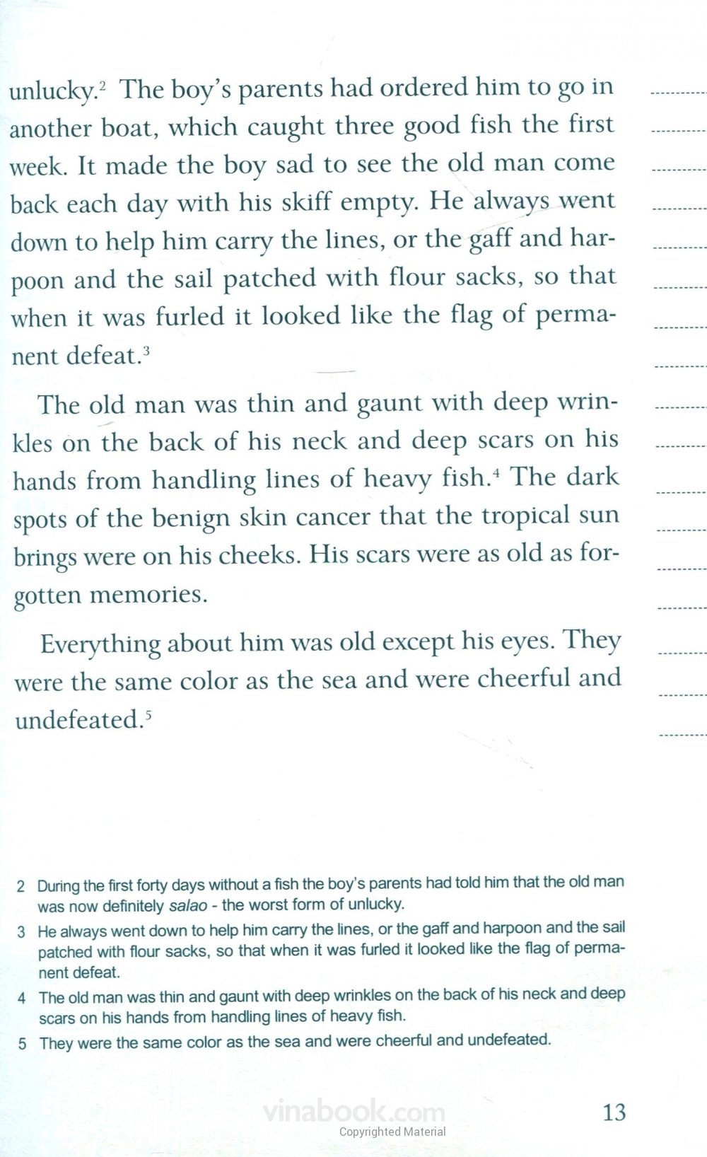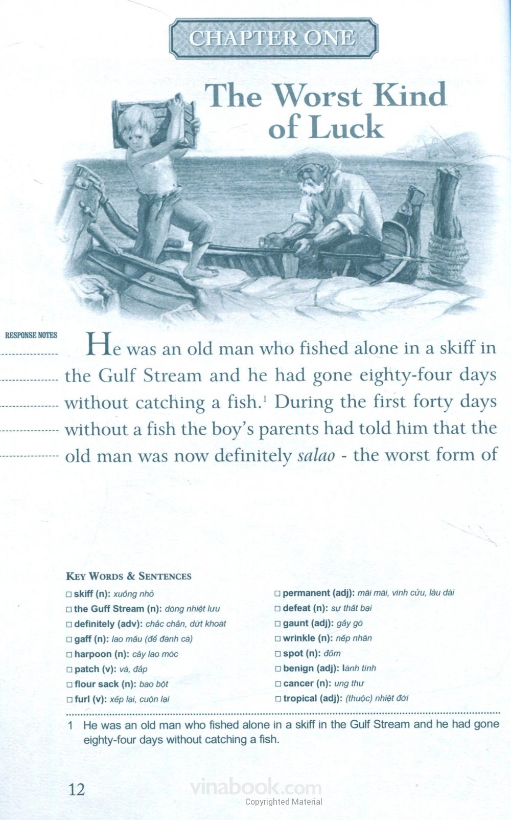 Cuốn sách Ông Già Và Biển Cả nguyên bản tiếng Anh sẽ giúp bạn đọc có thể luyện kỹ năng đọc hiểu tiếng Anh của mình qua câu chuyện đầy hấp dẫn này. Đặc biệt, cuốn sách rất dễ đọc cho những người mới bắt đầu, học sinh Tiểu học, Trung học. Người đọc cũng có thể hiểu được ý nghĩa sâu xa của câu chuyện mà các bản dịch chưa thể truyền tải hết.