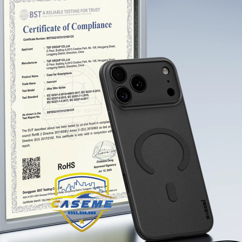 Ốp lưng iPhone Air, iPhone 17, iPhone 17 Pro, iPhone 17 Pro Max Memumi Slim Case Magnetic – siêu mỏng, sang trọng và tiện lợi Bạn cần một chiếc ốp lưng vừa bảo vệ điện thoại, vừa giữ nguyên vẻ đẹp sang trọng? Memumi Slim Case Magnetic chính là lựa chọn lý tưởng. Thiết kế siêu mỏng, tích hợp sạc không dây từ tính và bảo vệ hiệu quả. Thiết kế siêu mỏng – Trải nghiệm “dùng như không dùng” Memumi nổi bật với độ mỏng chỉ 0.33mm. Người dùng gần như không cảm nhận được sự hiện diện của ốp. Điện thoại vẫn giữ nguyên dáng mỏng nhẹ, dễ bỏ vào túi quần hoặc túi xách. Bề mặt nhám mịn, hạn chế trơn trượt và tạo cảm giác cầm nắm thoải mái. Tích hợp sạc không dây từ tính – Sạc nhanh, kết nối tiện lợi Điểm khác biệt lớn nhất là hỗ trợ sạc không dây từ tính. Vòng nam châm mạnh giúp iPhone kết nối chắc chắn với sạc và phụ kiện. Chỉ cần đặt lên đế sạc, máy tự căn chỉnh vị trí chính xác. Sạc nhanh, ổn định và tiện lợi hơn hẳn so với ốp thường. Bảo vệ cơ bản nhưng hiệu quả Dù mỏng nhẹ, Memumi Slim Case Magnetic vẫn bảo vệ tốt cho iPhone. Chất liệu PP/PC cao cấp chống trầy xước, chống bám vân tay và mồ hôi. Viền nhô cao quanh cụm camera và màn hình hạn chế trầy xước khi đặt trên bề mặt phẳng. So sánh với ốp thường