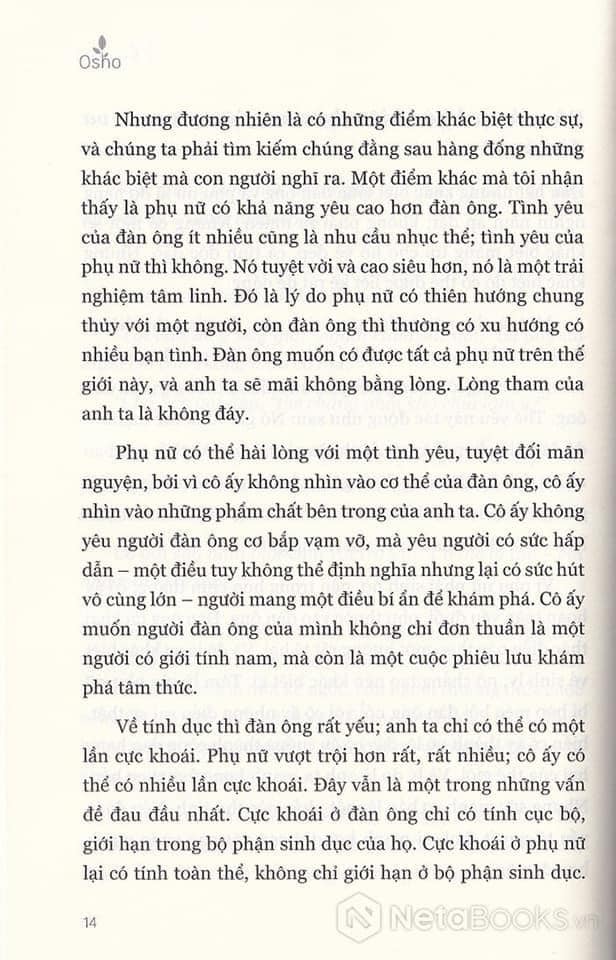 Người phụ nữ cần tự do toàn diện để có thể trao tự do cho đàn ông. Đây là một trong những điều căn bản phải nhớ: Nếu bạn biến ai đó thành nô lệ, thì cuối cùng, rốt cuộc bạn cũng sẽ bị giáng xuống thành nô lệ; bạn không thể còn được tự do. Nếu bạn muốn được tự do, hãy trao tự do cho người khác; đó là cách duy nhất để được tự do.