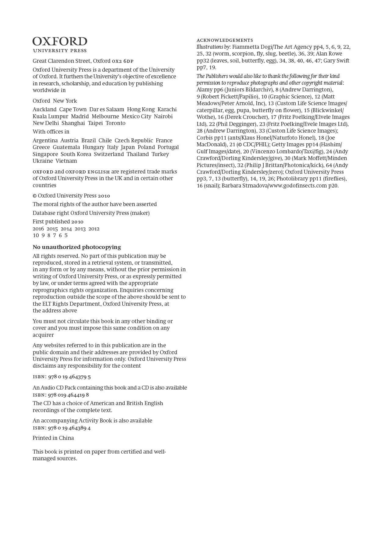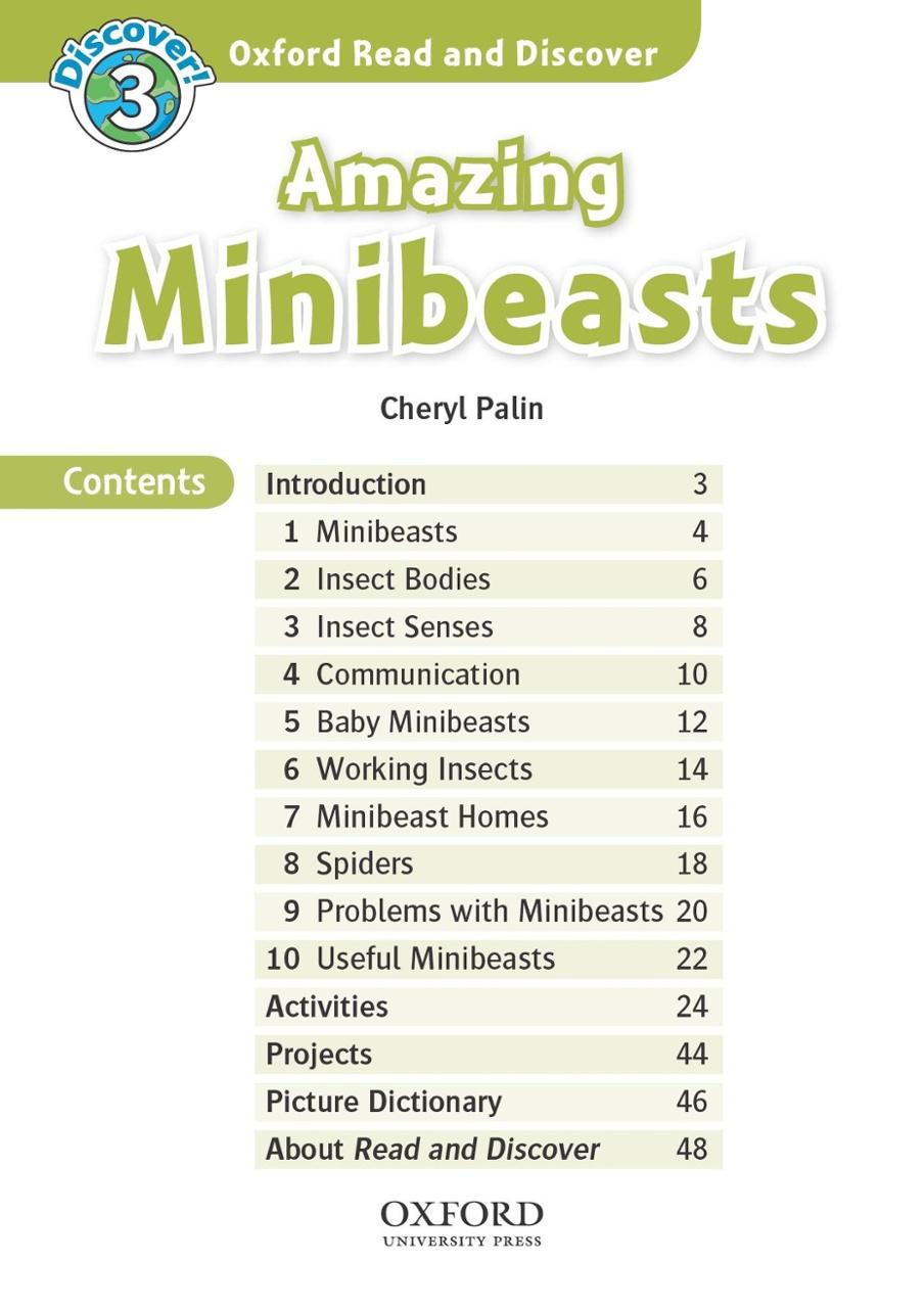 Oxford Read and Discover 3 Amazing Minibeasts This exciting new series of non-fiction readers provides interesting and educational content, with activities and project work. The readers are graded at four levels, from 3 to 6, suitable for students from age 8 and older. They can support Content and Language Integrated Learning (CLIL), and cover a broad range of topics, within three curriculum areas: The World of Science and Technology The Natural World The World of Arts and Social Studies