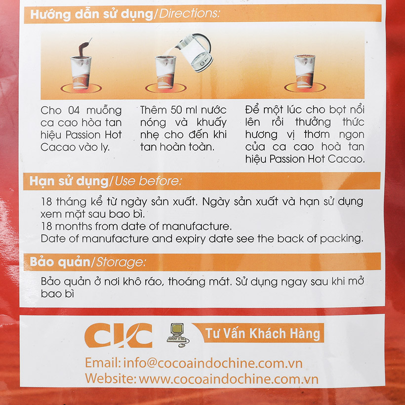 - Hướng dẫn sử dụng: Đổ một gói ca cao hiệu Passion Hot Cacao vào ly. Thêm 50 ml nước nóng và khuấy nhẹ cho đến khi tan hoàn toàn. Để một lúc cho bọt nổi lên rồi thưởng thức hương vị thơm ngon của ca cao hiệu Passion Hot Cacao.