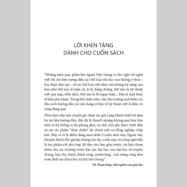 "Phản biện như một chuyên gia: Lập luận sắc bén và tư duy hiệu quả" là tác phẩm ra đời với tham vọng dùng góc nhìn phân tích của chuyên gia kết hợp với kỹ thuật lập luận ngắn gọn mà sắc nét của báo chí để dẫn dắt bạn đọc Việt Nam làm quen với tư duy phản biện theo một cách sống động, đầy hơi thở cuộc sống. Bản thảo được tác giả Lang Minh xây dựng dựa trên kinh nghiệm nhiều năm giảng dạy kỹ năng tư duy phản biện và viết các bài nghị luận xã hội cho mục Góc nhìn của VNExpress, nội dung sách kết hợp kiến thức từ sách vở với các ví dụ từ bài viết của các chuyên gia trên nhiều lĩnh vực.