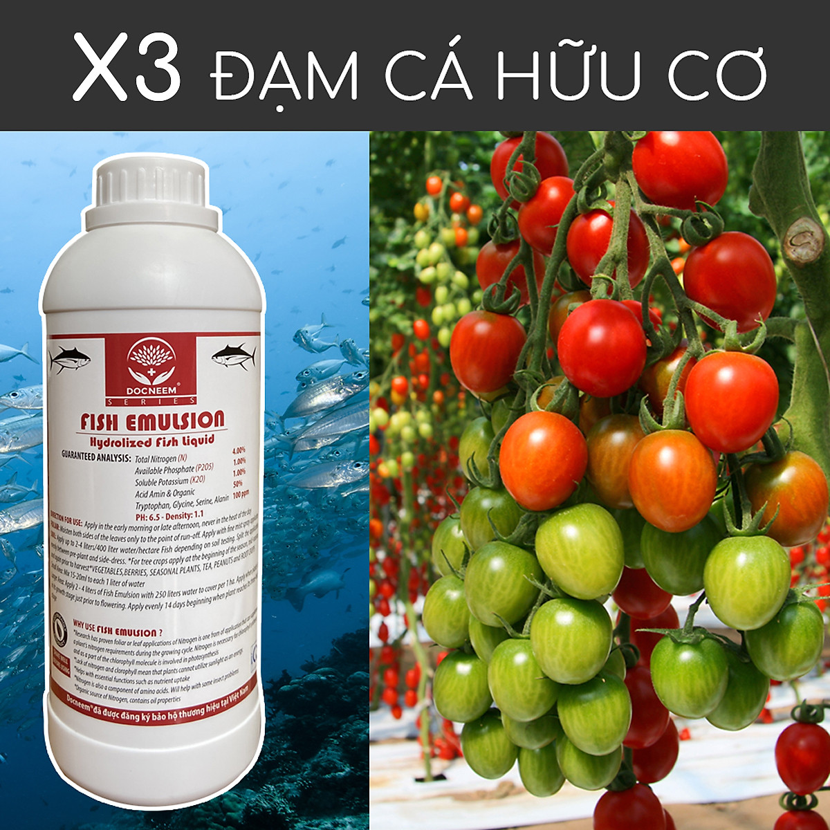 - Thương hiệu DOCNEEM được bảo hộ tại Cục sở hữu trí tuệ Việt Nam Dinh dưỡng tối ưu cho tất cả các loại cây: Rau sạch, Cây cảnh, Hoa hồng, Cây trong nhà và ngoài trời THÀNH PHẦN: N (4%), P2O5 (1%), K2O (1%), Acid amin hữu cơ (50%), PH: 6.5, Tỷ trọng 1.1 CÔNG DỤNG: FISH EMULSION là phân bón sinh học SIAMB 14 hữu cơ bón qua lá hoặc bón gốc tinh khiết đậm đặc, được chiết xuất từ cá Mòi biển nguyên con bằng phương pháp thủy phân lấy từ vùng biển lạnh, đặc biệt bổ sung hữu cơ trung vi lượng Cl, Na, Ca, Mg, S và các acid amin Tryptophan, Glycine, Serine, Alanin giúp cây hấp thụ tức thì chất đạm hữu cơ. Cây lớn nhanh, lá xanh dày. Tăng năng suất và chất lượng sản phẩm sau thu hoạch. Tăng chất đề kháng thích ứng với đất bị pha cát, bạc màu. CÁCH SỬ DỤNG: Dùng cho tất cả các loại cây trồng, theo từng giai đoạn phát triển của cây.