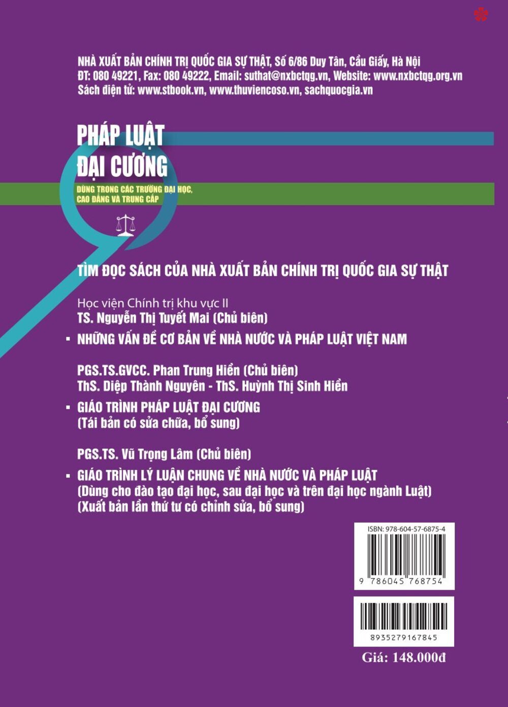 Tên đề tài: Pháp Luật Đại Cương Tác giả: Nguyễn Thị Thanh Thuỷ (Chủ biên), Đào Thu Hà, Trần Văn Nam, Nguyễn Hợp Toàn, Trần Thị Hồng Nhung, Mai Thị Chúc Hạnh Năm tái bản: 2022 Khổ