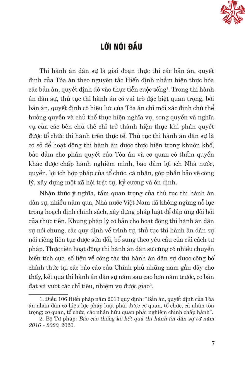 ''Pháp luật thủ tục thi hành án dân sự'' Nội dung cuốn sách bao gồm 10 chương, tập trung phân tích từng vấn đề cụ thể về thủ tục trong thi hành án dân sự hiện nay ở Việt Nam và liên hệ với pháp luật thi hành án dân sự ở một số quốc gia trên thế giới.