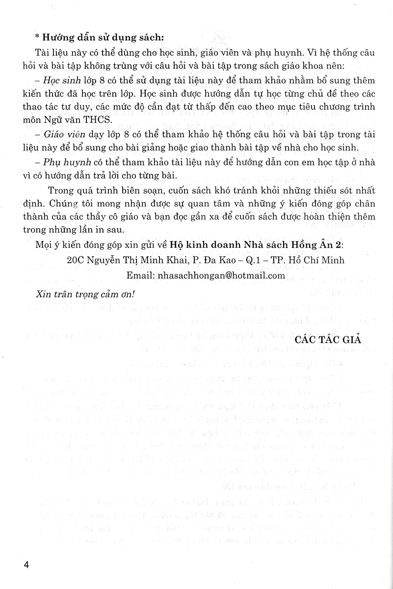 - Học sinh lớp 8 có thể sử dụng cuốn sách này để tham khảo nhằm ôn tập và bổ sung các kiến thức đã học trên lớp. Học sinh được hướng dẫn tự học từng chủ đề theo các thao tác tư duy, các mức độ cần đạt từ thấp đến cao theo mục tiêu của Chương trình môn Ngữ văn THCS.