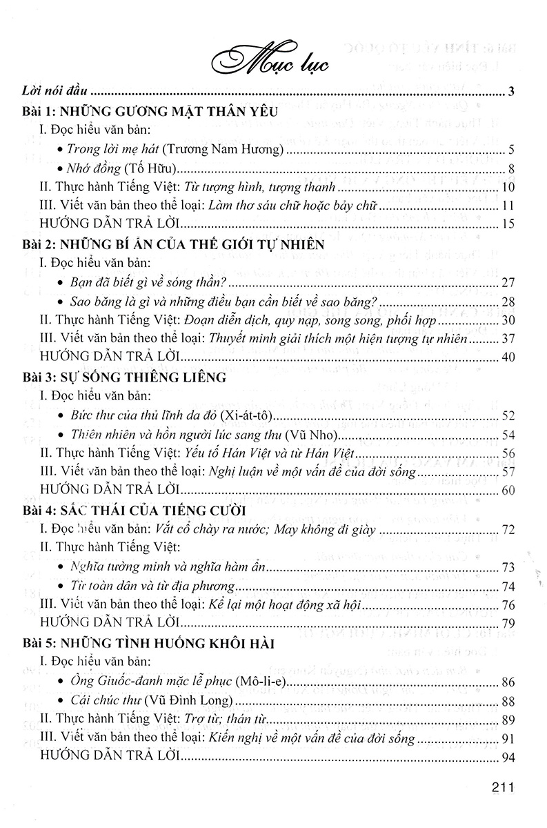 - Viết văn bản theo thể loại: Hướng dẫn học sinh các thao tác để viết được văn bản theo đúng thể loại mà bài học yêu cầu: từ hướng dẫn lựa chọn đề tài, xác định mục đích viết, chuẩn bị tư liệu cho bài viết đến hướng dẫn tìm ý và lập dàn ý, viết bài và chỉnh sửa bài viết thông qua bảng kiểm và nhận diện các lỗi thường mắc của học sinh. – Phần hai: Hướng dẫn trả lời Phần này, cuốn sách đưa ra các gợi ý, hướng dẫn, tư liệu tham khảo, các thao tác để học sinh tự trả lời các câu hỏi và bài tập ở phần một nhằm phát triển năng lực ngôn ngữ và tư duy ở người học. Nhiều câu hỏi học sinh có thể tự trả lời theo hiểu biết và quan điểm cá nhân, khuyến khích sự độc lập suy nghĩ và sáng tạo.