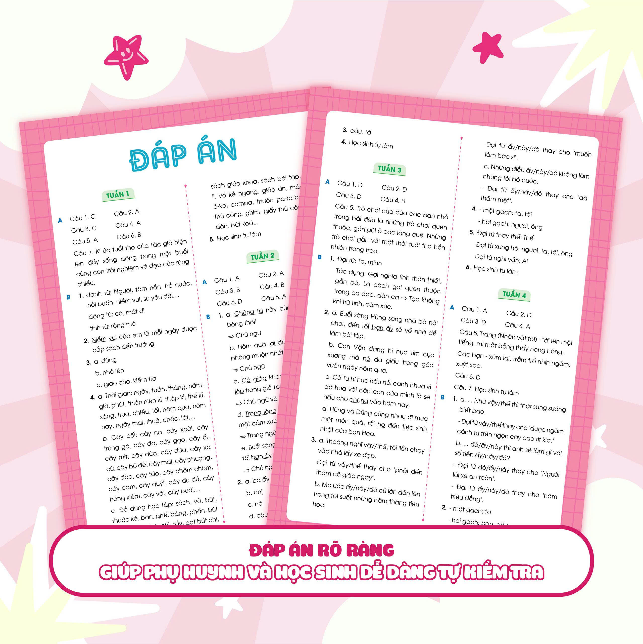 Bộ sách gồm các bài luyện tập chia theo tuần, ôn tập tổng quát kiến thức của 35 tuần học. Ngoài ra, cuốn sách cũng cung cấp các bài kiểm tra giữa kỳ và cuối kỳ để các con trau dồi thêm, tự tin chinh phục điểm cao trong các bài kiểm tra trên lớp.