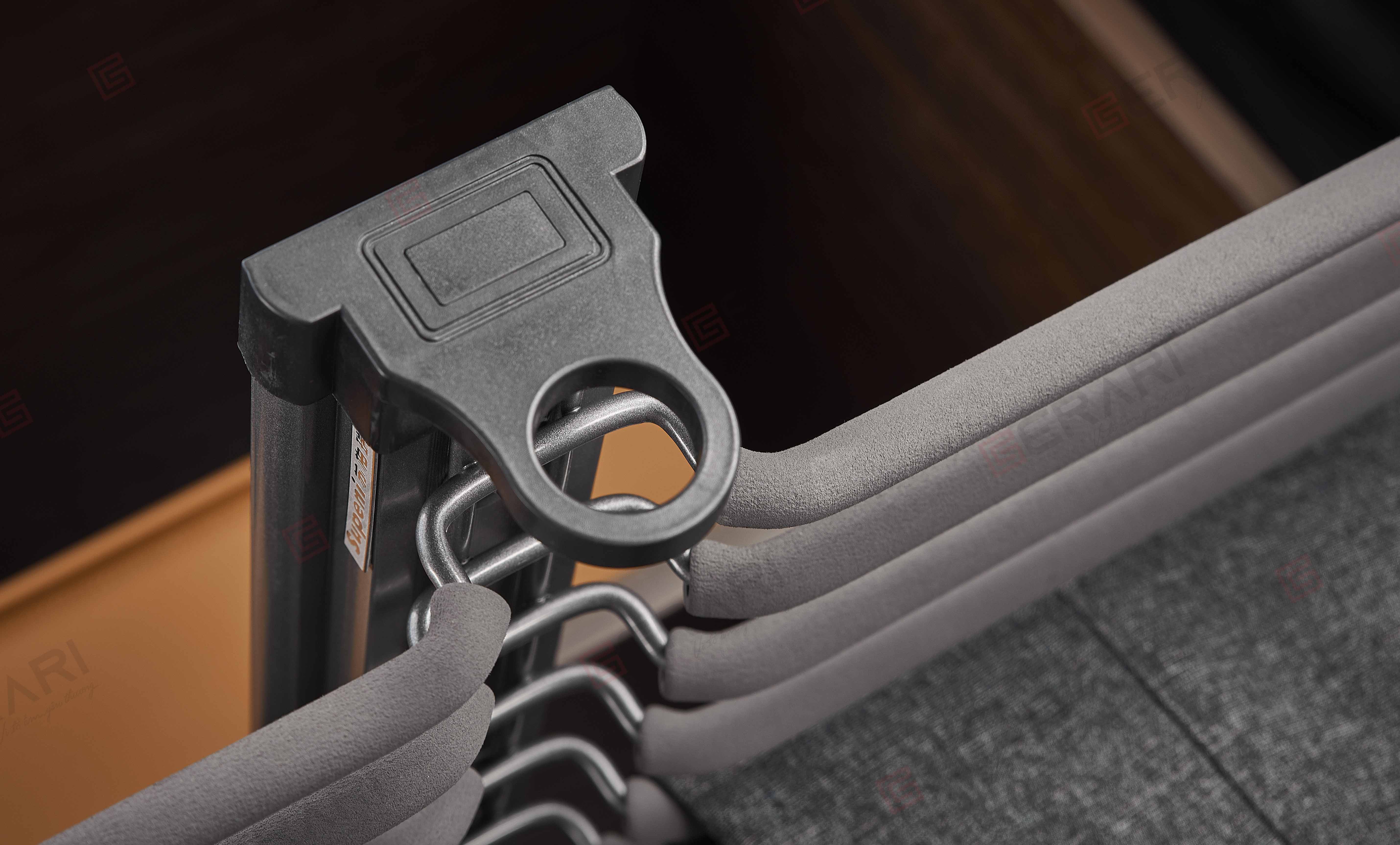 Phụ kiện của tủ áo - Giá treo quần âu âm tủ ray giảm chấn là bộ giá treo đa dụng được thiết kế tích hợp âm vào tủ quần áo với hệ ray trượt