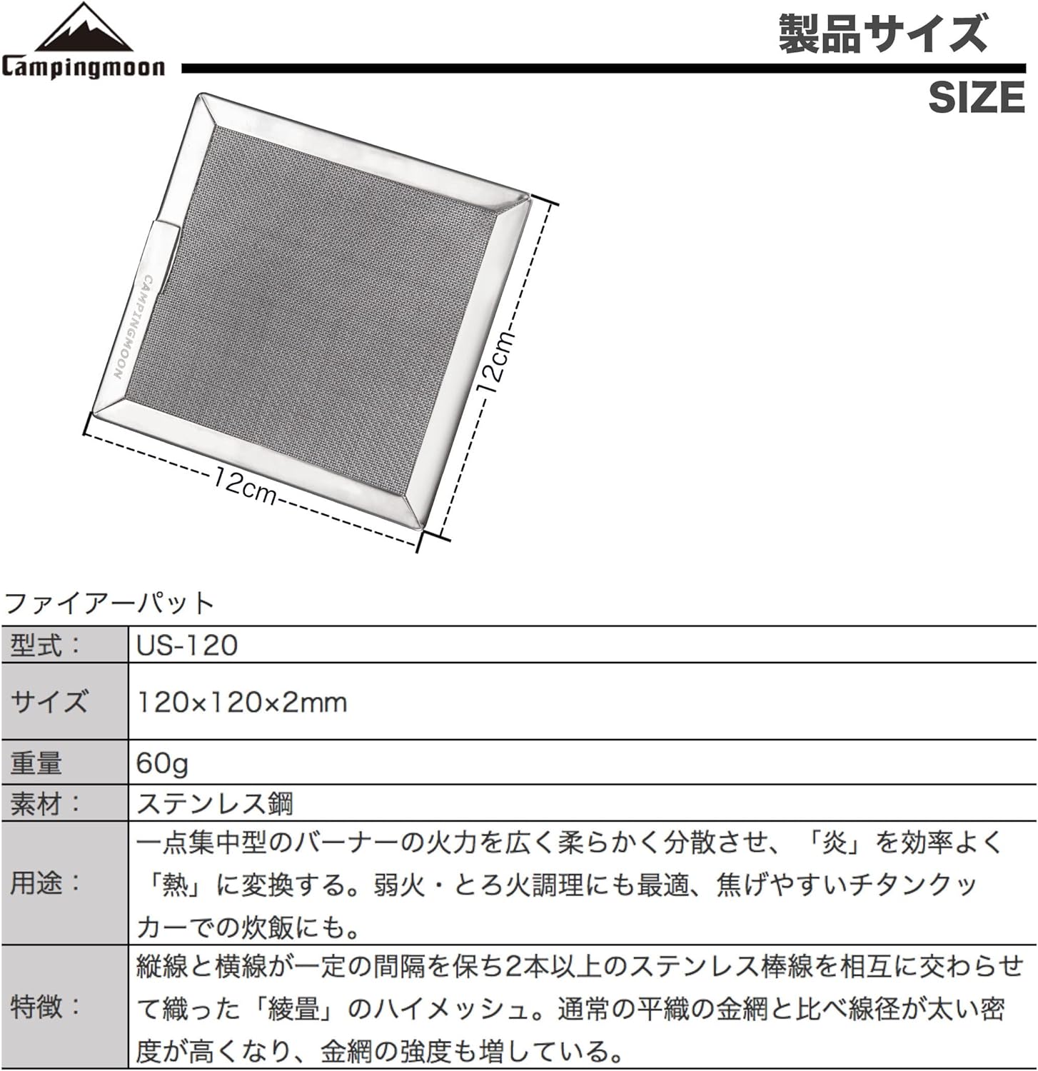 Phụ kiện lưới tản đều nhiệt Campingmoon US-120 giúp biến "ngọn lửa" thành "nhiệt", giúp nhiệt độ bếp được tản đều làm đồ ăn được đun nấu nhanh hơn. Lưới có thể sử dụng cho bếp gas, bếp củi, bếp than,