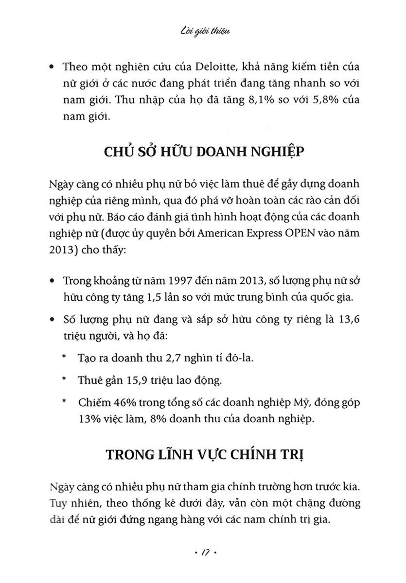"Cùng với sự thay đổi ảnh hưởng của phụ nữ toàn cầu và những thay đổi trong cách thức kinh doanh đã được tạo ra, tôi tin rằng phụ nữ chúng ta đang ở điểm bùng phát của những cơ hội thành công. Trong những năm qua, nhiều phụ nữa đã chia sẻ với tôi rằng họ muốn có một cuốn sách định hướng liên quan đến họ và tác giả của nó là một người phụ nữ thành công trong cuộc sống.