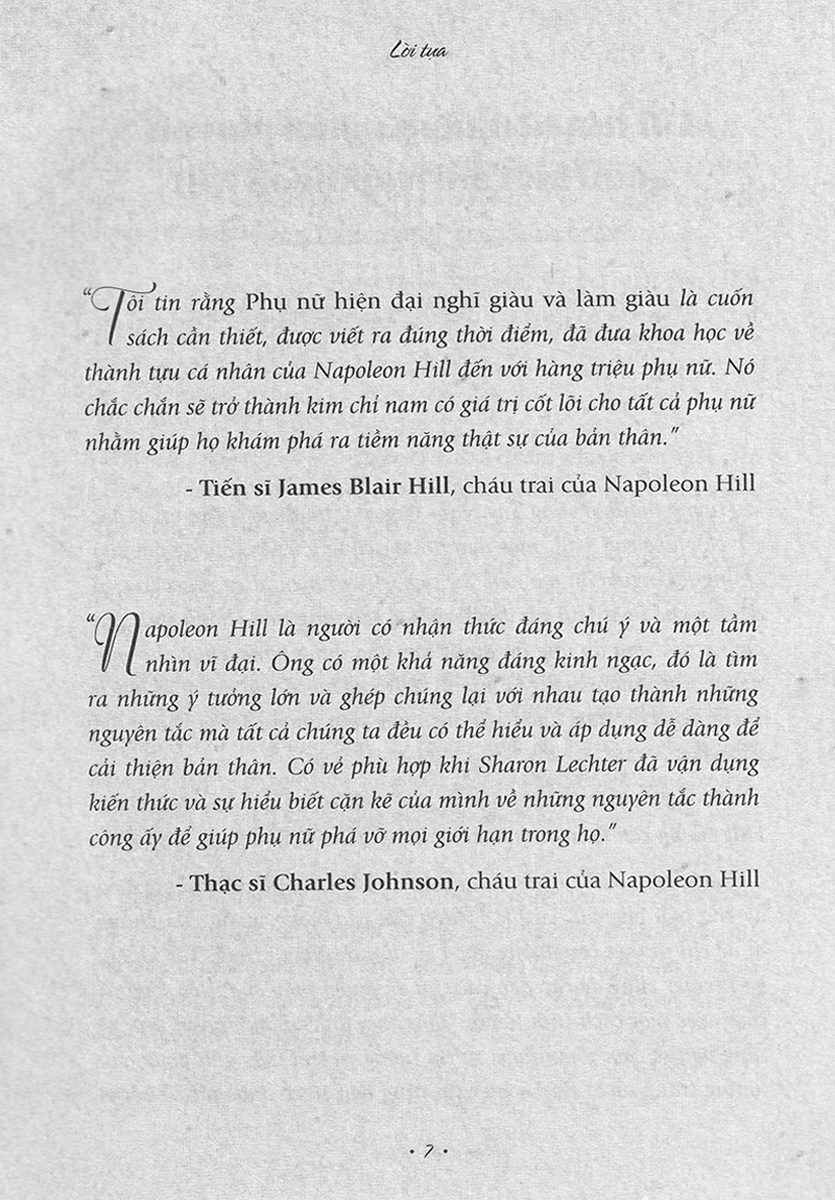 Sharon Lechter là một điển hình tiêu biểu của phụ nữ hiện đại, thành công, tạo dựng một cuộc đời giàu có không chỉ về tài chính mà còn về giá trị con người. Bà hiện là một chuyên gia quốc tế về tài chính được trọng vọng trong vai trò là thành viên hộ đồng Tư vấn Tài chính cho hai đời tổng thống Mỹ là G. W. Bush và Barack Obama. Bà đồng thời là một nhà từ thiện, nhà giáo dục, diễn giả quốc tế, và là tác giả của nhiều đầu sách bán chạy trên thế giới. Mang đến độc giả bước nối dài trong hành trình giúp đỡ doanh giới của Napoleon Hill, cuốn sách của Sharon tâp trung khai thác những hình mẫu thành công điển hình của doanh nhân nữ, trong môi trường kinh doanh quốc tế.