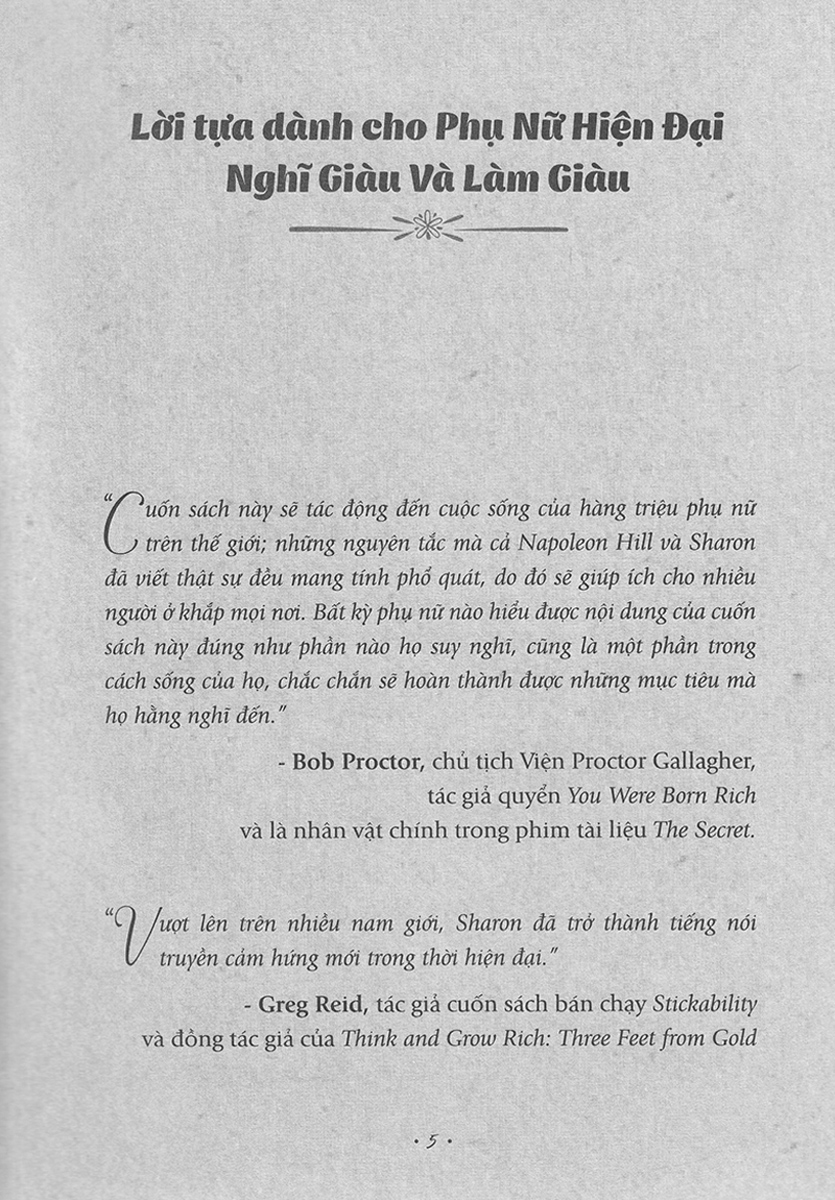 Tôi đã nghiên cứu về những người phụ nữ thành công trong quá khứ, đã phỏng vấn những người phụ nữ thành công ở hiện tại và nghiền ngẫm Nghĩ Giàu Và Làm Giàu của Napoleon Hill, từ đó đẻ ra 13 bước đề tiến tới thành công cho nữ giới dưới góc nhìn và kinh nghiệm của những người phụ nữ đã thành công này. Tôi đã từ chối viết sách cho phụ nữ trong suốt nhiều năm qua, nhưng giờ chính xác là thời điểm hoàn hảo dành cho Phụ Nữ Hiện Đại Nghĩ Giàu Và Làm Giàu." (Sharon Letcher).