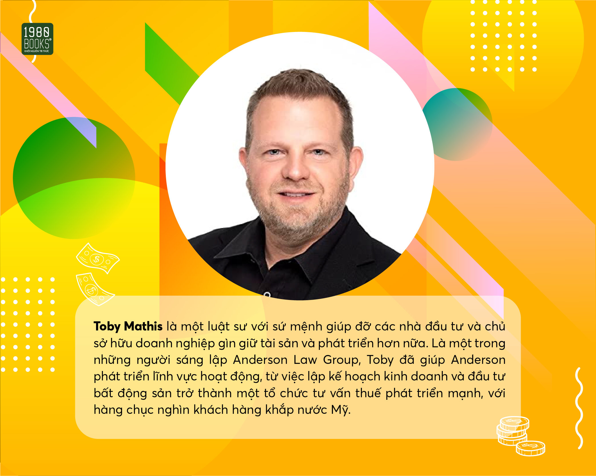 • Về tác giả Toby Mathis là một luật sư với sứ mệnh giúp đỡ các nhà đầu tư và chủ sở hữu doanh nghiệp gìn giữ tài sản và phát triển hơn nữa. Là một trong những người sáng lập Anderson Law Group, Toby đã giúp Anderson phát triển lĩnh vực hoạt động, từ việc lập kế hoạch kinh doanh và đầu tư bất động sản trở thành một tổ chức tư vấn thuế phát triển mạnh, với hàng chục nghìn khách hàng khắp nước Mỹ.