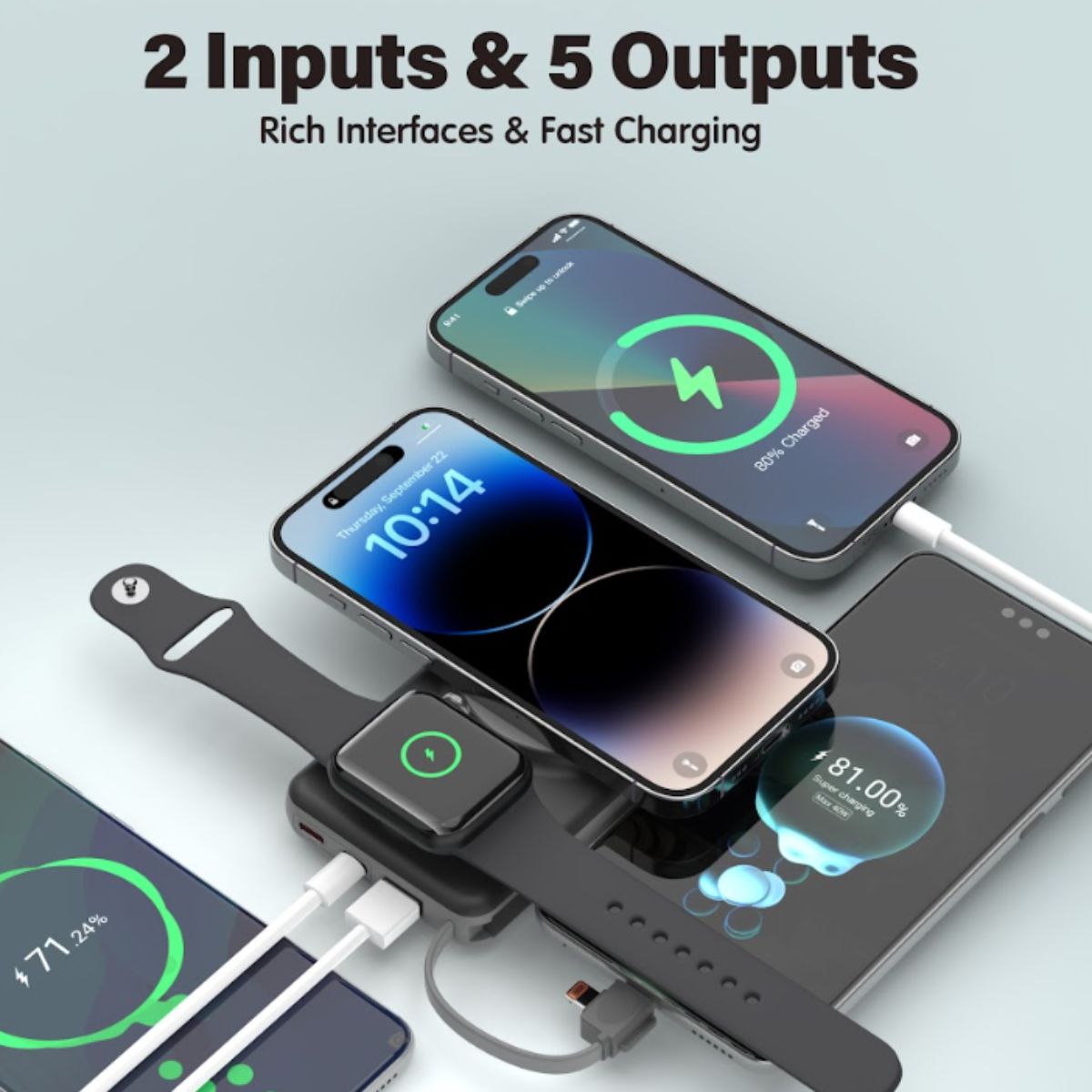Cung cấp sạc không dây từ tính 15W cho i.Phone 12 trở lên, công suất 2.5W dành riêng cho Ap.ple Watch và 3W cho tai nghe không dây.