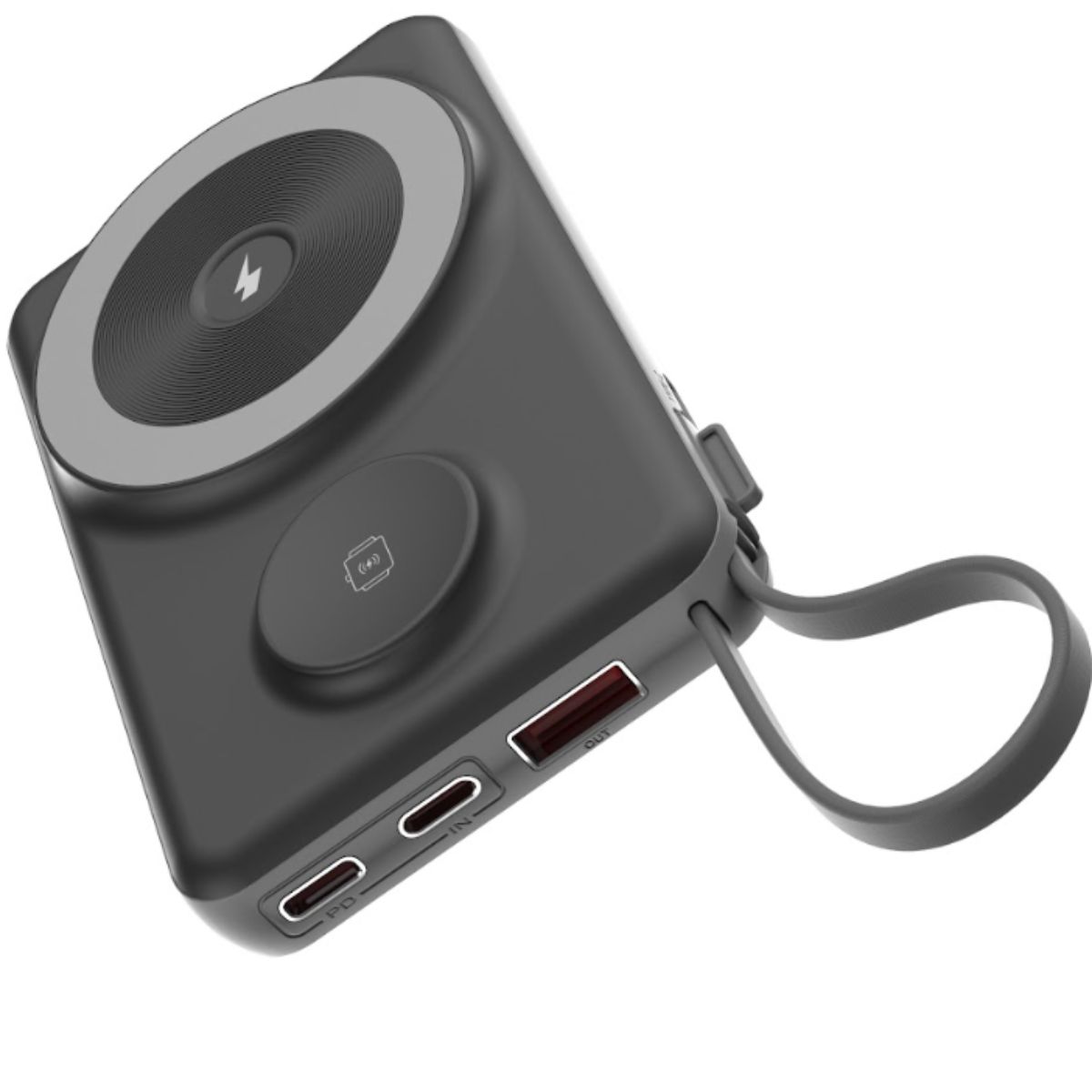 Được tích hợp thêm quai cầm, có thể móc balo hoặc treo vào bất cứ đâu để mang đi mọi nơi rất tiện lợi. Đồng thời cũng là 2 cáp sạc Type-C và Light.ning độc lập dễ dàng tháo và sạc bất cứ đâu.