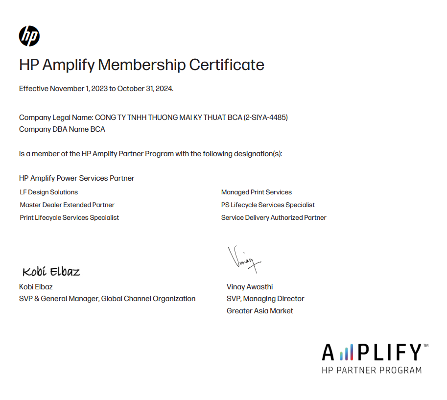 CAM KẾT HÀNG CHÍNH HÃNG 100% CÔNG TY TNHH THƯƠNG MẠI KỸ THUẬT BCA vinh dự được HP Việt Nam xác nhận và chứng thực là đối tác được ủy quyền kinh doanh sản phẩm