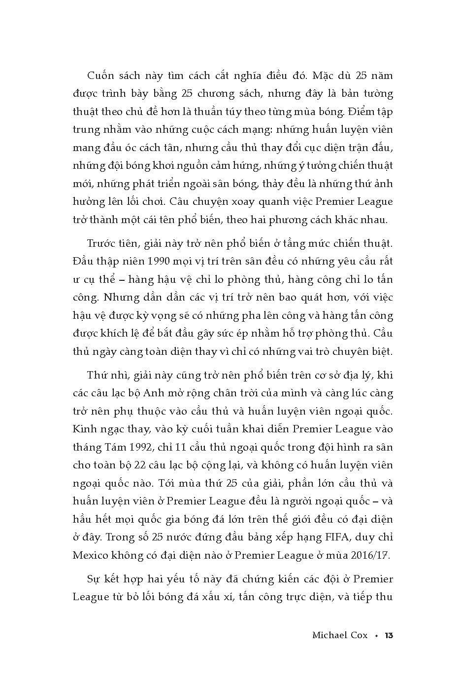 Tác giả Michael Cox tìm cách cắt nghĩa điều đó. Mặc dù 25 năm được trình bày bằng 25 chương sách, nhưng đây là bản tường thuật theo chủ đề hơn là thuần tuý theo từng mùa bóng. Điểm tập trung nhằm vào những cuộc cách mạng: những huấn luyện viên mang đầu óc cách tân, nhưng cầu thủ thay đổi cục diện trận đấu, những đội bóng khơi nguồn cảm hứng, những ý tưởng chiến thuật mới, những phát triển ngoài sân bóng, thảy đều là những thứ ảnh hưởng lên lối chơi. Câu chuyện xoay quanh việc Premier League trở thành một cái tên phổ biến, theo hai phương cách khác nhau.