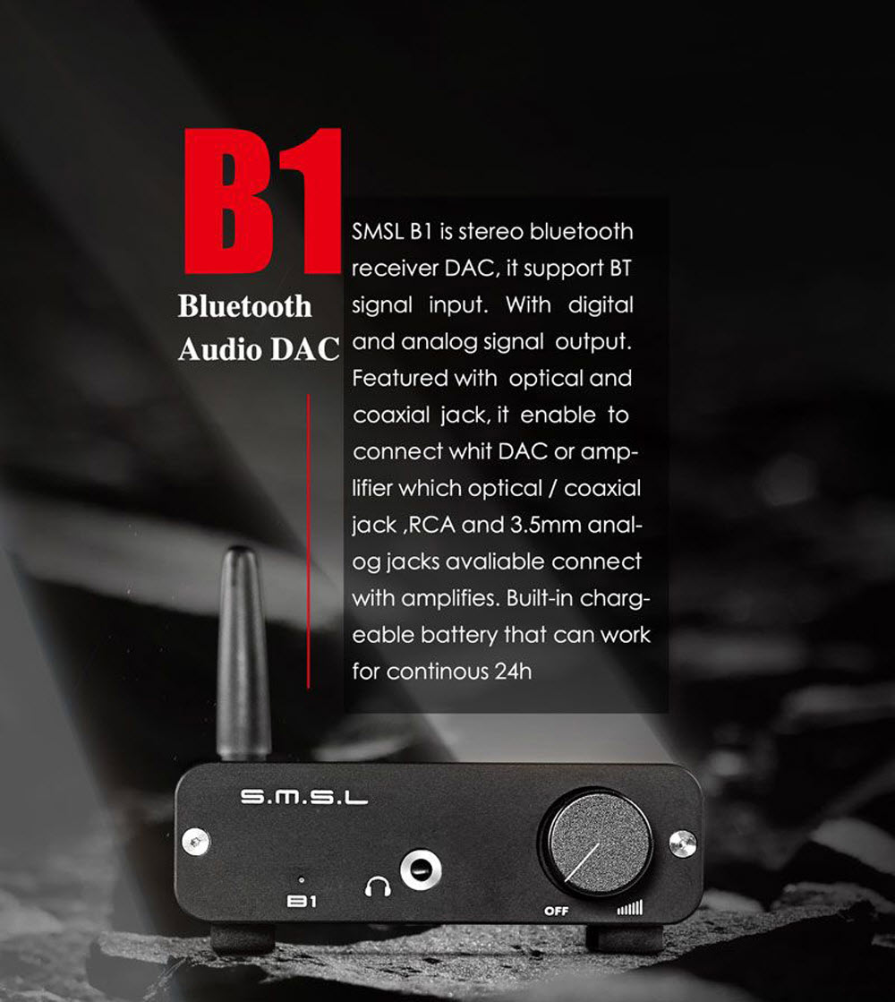 SMSL Audio B1 - Bộ DAC Giải Mã Âm Thanh Bluetooth 4.2 NFC aptX S.M.S.L B1 - DAC Bluetooth 4.2 & NFC, aptX. - Dac Bluetooth 4.2 & NFC, aptX, SMSL Audio B1 - S.M.S.L B1 HiFi Stereo Audio Bluetooth CSR 4.2 Receiver DAC with NFC Lưu ý: Đầu ra RCA không chỉnh được âm lượng, nút chỉnh âm lượng chỉ áp dụng cho cổng 3.5mm cắm tai nghe Đầu thu âm thanh Bluetooth SMSL B1 có công nghệ AptX và cho phép bạn tận hưởng không dây chất lượng cao trên các thiết bị không có tính năng cơ bản này. Nhờ công nghệ Bluetooth 4.2 aptX của nó , không có sự chậm trễ và độ trễ âm thanh trên các thiết bị aptX Certified Low Latency. SMSL B1 được trang bị DAC Wolfson WM8524 , giải mã luồng lên tới 24Bit / 192kHz. Nó cũng có một bộ khuếch đại tai nghe MAX97220A tai nghe lái xe lên đến 32 Ohm / 65mW thông qua đầu ra jack 3.5mm của nó. Chuẩn Bluetooth mới 4.2; Chất lượng cao của âm thanh được truyền tải; Đầu Ra: quang/đồng trục/RCA/3.5mm cổng tai nghe; 24 giờ liên tục phát lại; hơn 10 m khoảng cách truyền dẫn; Hỗ Trợ APT-X-ray truyền tải; Pin sạc 2.5 giờ. B1 là DAC giải mã âm thanh kỹ thuật số chất lượng cao, hỗ trợ bluetooth tín hiệu đầu vào, quang học và đồng trục giao diện kỹ thuật số, các đầu ra kỹ thuật số thuận tiện để lấy bộ giải mã hoặc hỗ trợ quang học/đồng trục giải mã khuếch đại công suất; Giao đầu ra RCA và 3.5mm Tai nghe, RCA đầu ra analog có thể kết nối khuếch đại công suất/loa hoạt động (RCA khối lượng quy định), 3.5mm tai nghe kết nối trực tiếp để nghe; Được thiết kế Pin trong, có thể đạt được 24 giờ sử dụng liên tục, Sử dụng cả ngày để nghe nhạc với thời gian sạc ngắn - Thời gian sạc: 2.5 giờ Lưu ý: xin vui lòng không thường xuyên khởi động tắt máy, khoảng thời gian giữa khởi động bình thường tắt phải được nhiều hơn 3 giây. Đầu ra: quang/đồng trục/RCA/3.5mm tai nghe Hỗ trợ APT-X truyền