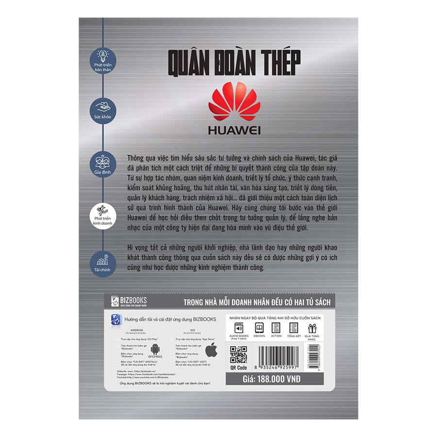 Cuốn sách này, thông qua việc tìm hiểu sâu sắc tư tưởng, chính sách của hua.wei để phân tích triệt để bí quyết thành công của “quân đoàn thép” hua.wei”. Từ sự hợp tác nhóm, quan niệm kinh doanh, triết lý tổ chức, ý thức cạnh tranh, kiểm soát khủng hoảng, thu hút nhân tài, văn hóa sáng tạo, triết lý dòng tiền, quản lý khách hàng, trách nhiệm xã hội…đã giới thiệu toàn diện lịch sử quá trình hình thành của hua.wei. Hãy cùng Bizbooks bước vào thế giới hua.wei để học hỏi điều then chốt trong tư tưởng quản lý, để lắng nghe bản nhạc của một công ty hiện đại đang hòa mình vào vũ điệu thế giới. Hy vọng tất cả những người khởi nghiệp, nhà lãnh đạo hay những người khao khát thành công thông qua cuốn sách này đều sẽ có được những gợi ý có ích, học đươc những kinh nghiệm thành công.