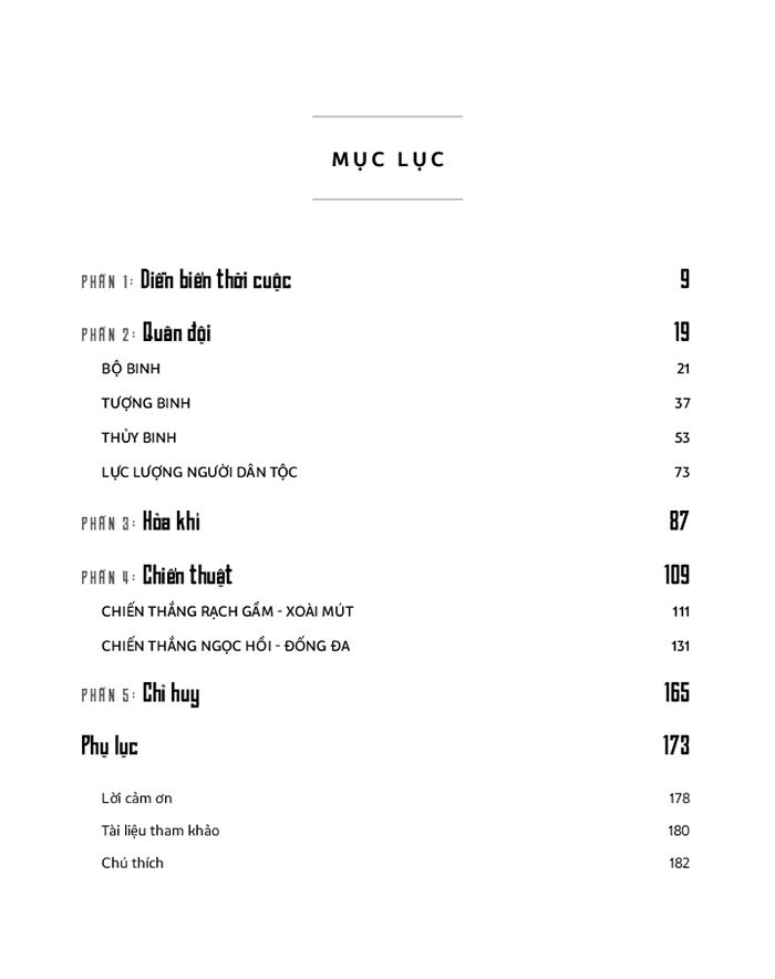 Quân đội Tây Sơn dưới sự lãnh đạo của thiên tài quân sự Quang Trung - Nguyễn Huệ đã giành nhiều chiến thắng lẫy lừng. Độc giải từng nghe nhiều về trận Rạch Gầm - Xoài Mút hay chiến dịch đại phá quân Thanh, nhưng nguyên nhân đằng sau những chiến thắng đó thì ít ai hiểu rõ. Sách giúp mổ xẻ những chiến thắng đó bằng những thông tin và gần 250 hình ảnh minh họa từ những nguồn tư liệu trong và ngoài nước. Ngoài tư duy quân sự cách tân, những chiến thuật mưu trí và sự xông pha đi đầu trong trận mạc của Nguyễn Huệ, quân đội với tổ chức quy củ và hiện đại gồm bộ binh, tượng binh, thủy binh, lực lượng có sự tham gia đông đảo của người Thượng, người Chăm, vũ khí sử dụng hỏa khí là trung tâm đã giúp quân đội Tây Sơn có được sức mạnh vượt trội.