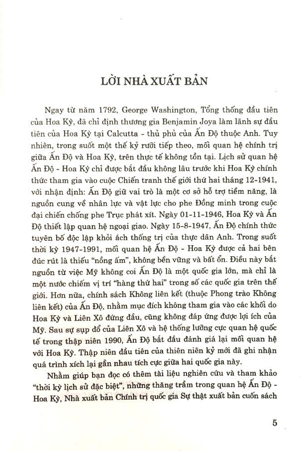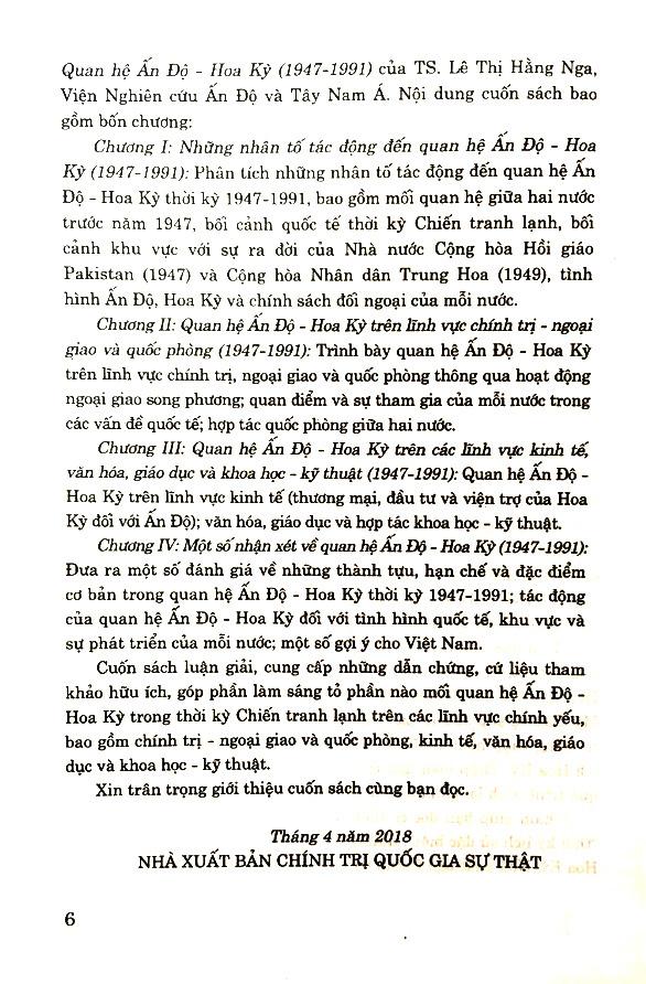 Mua tại TiktokQuan Hệ Ấn Độ - Hoa Kỳ (1947 - 1991) Cuốn sách luận giải, cung cấp những dẫn chứng, cứ liệu tham khảo hữu ích, góp phần làm sáng tỏ phần nào mối quan hệ Ấn Độ - Hoa Kỳ trong thời kỳ Chiến tranh lạnh trên các lĩnh vực chính yếu, bao gồm bốn chương: Chương I: Những nhân tố tác động đến quan hệ Ấn Độ - Hoa Kỳ; Chương II: Quan hệ Ấn Độ - Hoa Kỳ trên lĩnh vực chính trị - ngoại giao và quốc phòng; Chương III: Quan hệ Ấn Độ - Hoa Kỳ trên các lĩnh vực kinh tế, văn hóa, giáo dục và khoa học - kỹ thuật; Chương IV: Một số nhận xét về quan hệ Ấn Độ - Hoa Kỳ .