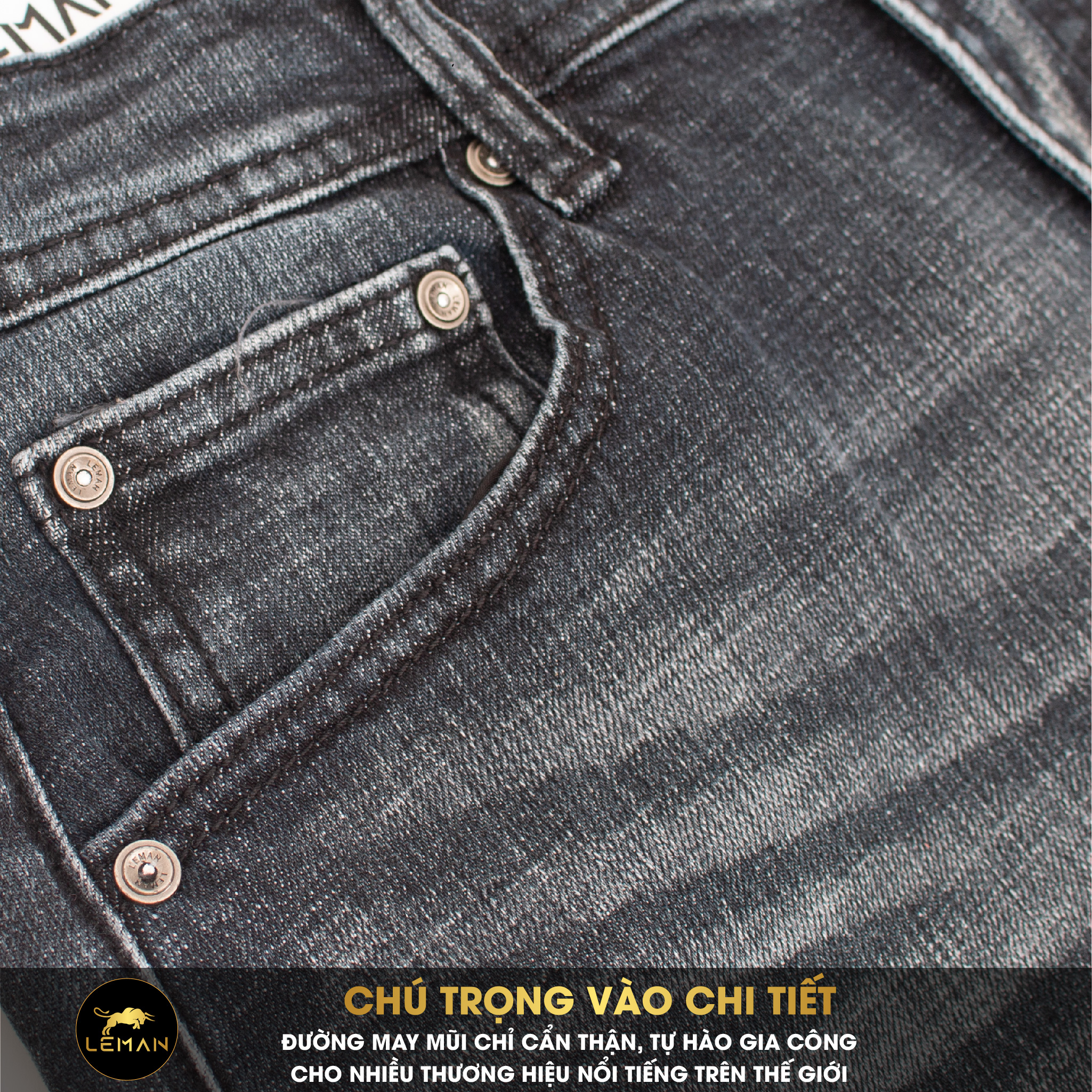 ĐẶC ĐIỂM NỔI BẬT QUẦN JEAN SORT LEMAN CAO CẤP JL01 1. Nút được đúc nguyên khối bằng đồng và nổi bật thương hiệu LEMAN đảm bảo độ bền tuyệt đối theo thời gian và