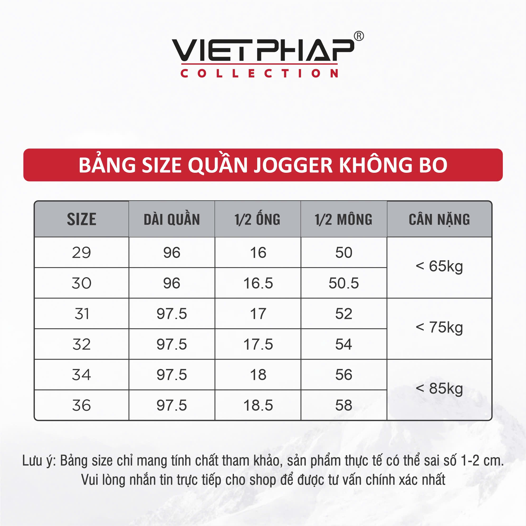 - Đổi trả hàng theo đúng quy định của Tiki VietPhap Collection Sản xuất tại: CTY TNHH May Mặc – Thời Trang Việt Pháp Cùng bạn làm nên phong cách! LƯU Ý: - Bảng size chart chỉ mang tính chất tham khảo, tùy thuộc vào số đo cơ thể mỗi người và chất liệu vải khác nhau sẽ có sự chênh lệch nhất định từ 1 - 2cm.