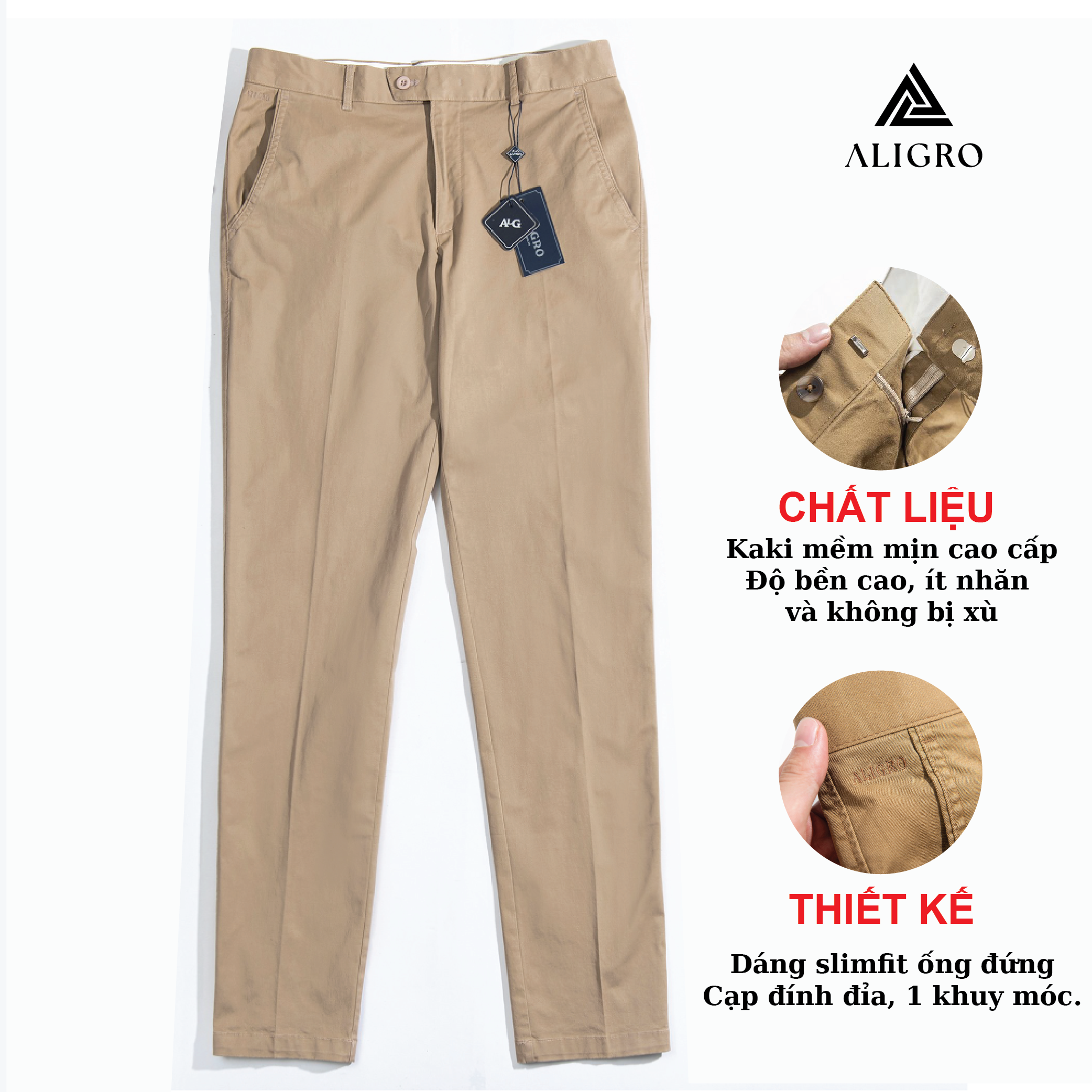 Mua tại TiktokGIỚI THIỆU THƯƠNG HIỆU Mang trong mình tầm nhìn chiến lược trở thành thương hiệu “Thời trang nam được yêu thích nhất Việt Nam” nên Aligro luôn chú trọng nghiên cứu phát triển mẫu mã, phom dáng phù hợp với vóc dáng hình thể đàn ông Việt. Sản phẩm của chúng tôi mang tới hình ảnh trẻ trung, năng động, hiện đại mà không kém phần lịch sự, sang trọng - cam kết mang lại giá trị đích thực và một cuộc sống thịnh vượng hơn cho phái mạnh Việt. CHI TIẾT THIẾT KẾ QUẦN KAKI NAM ALIGRO
