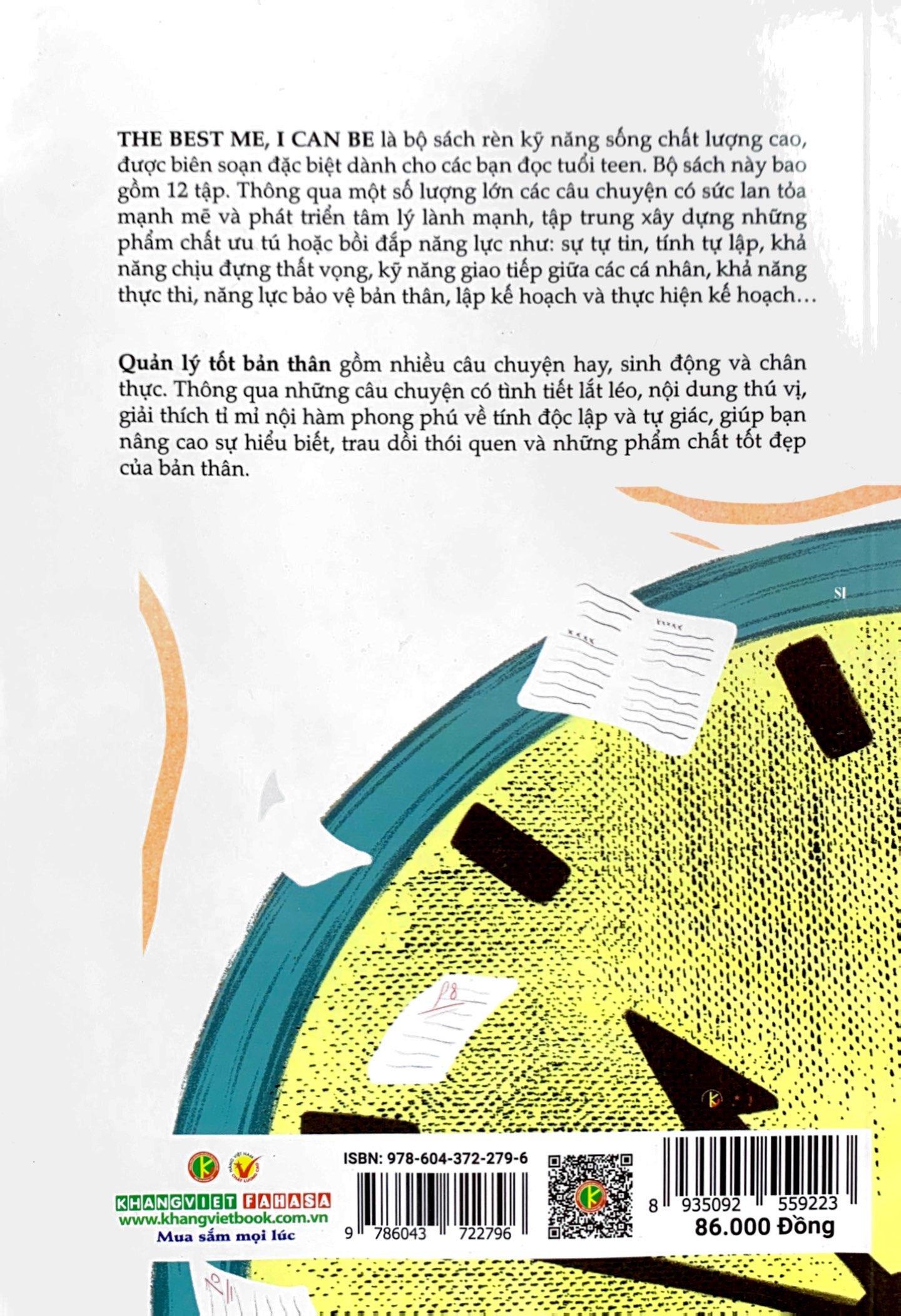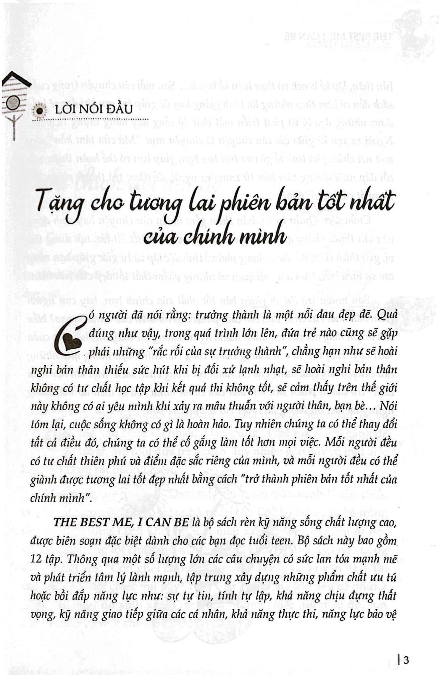 Mua tại TiktokThe Best Me, I Can Be là bộ sách rèn luyện kỹ năng sống chất lượng cao, được biên soạn đặt biệt dành cho các bạn tuổi teen. Bộ sách này gồm 12 tập. Thông qua một số lượng lớn các câu chuyện có sức lan tỏa mạnh mẽ và phát triển tâm lý lành mạnh, tập trung xây dựng những phẩm chất ưu tú và bồi đắp năng lực như: sự tự tin, tính tự lập, khả năng chịu đựng thất vọng, kỹ năng giao tiếp giữa các cá nhân, khả năng thực thi, nâng lực tự bảo vệ bản thân, lập kế hoạch và thực hiện kế hoạ