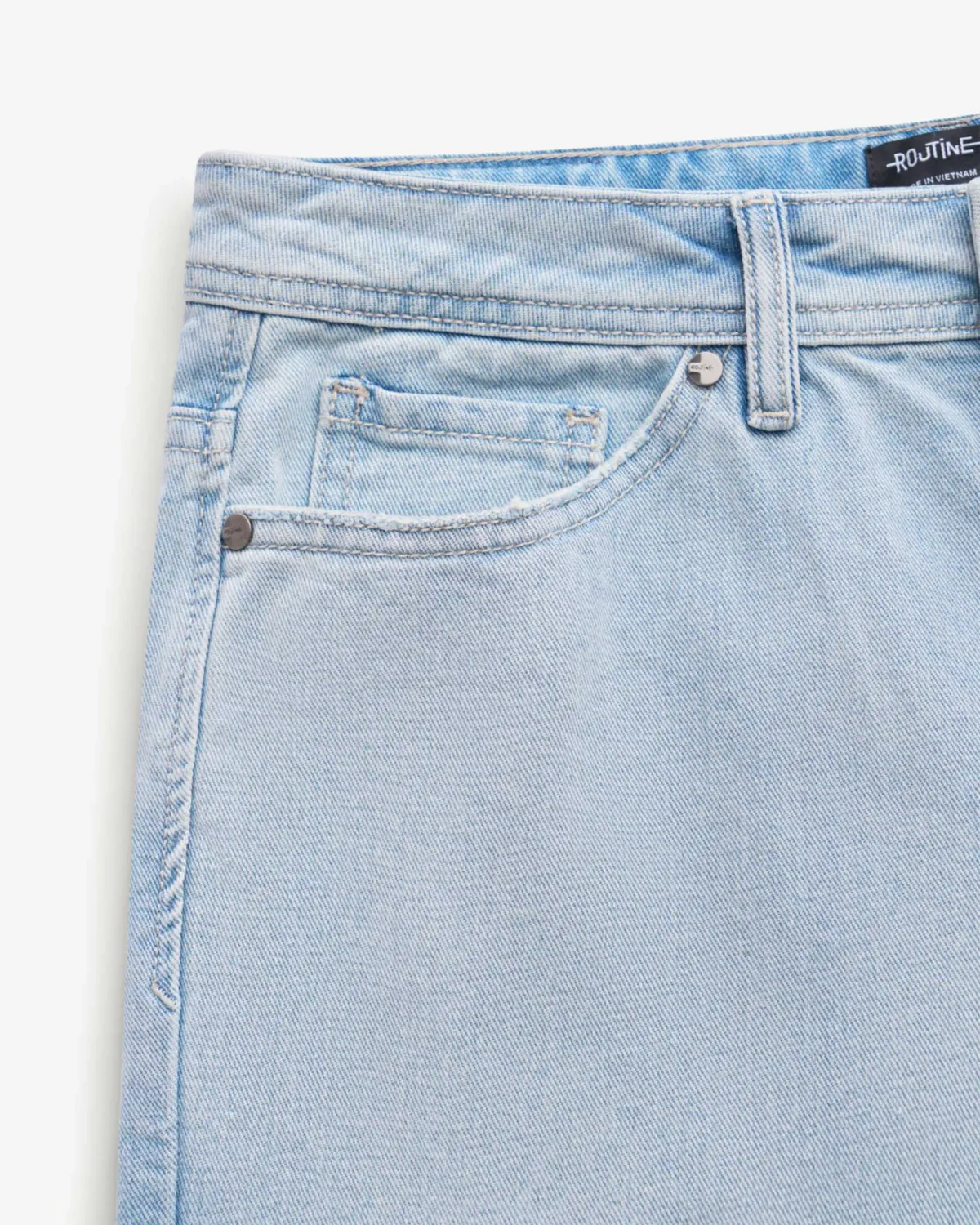 Quần short jean nam màu Xanh nhạt Form Straight - RT 10S25DPS001 | ROUTINE CÀ MAU Đặc điểm nổi bật Form : Straight Fabric : Denim Gender: Nam Collection: Essential 25 Sản phẩm này là