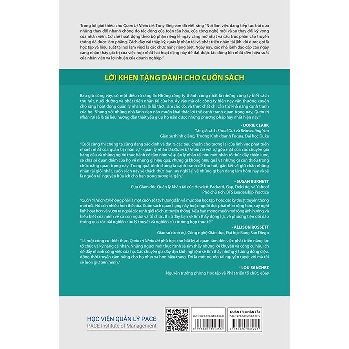 “Cuối cùng thì chúng ta cũng đang xác định và đặt ra các tiêu chuẩn cho tương lai của lĩnh vực phát triển nhanh nhất của quản trị nhân sự - quản lý nhân tài. Quản trị Nhân tài với sự góp mặt của các chuyên gia hàng đầu và những người thực hành có tầm nhìn về quản lý nhân tài như một nhân tố thúc đẩy chiến lược, sẽ chia sẻ quan điểm của họ về những gì hiệu quả, những gì không hiệu quả và những gì còn thiếu trong chức năng quan trọng này. Trong quá trình chúng ta cạnh tranh để thu hút, gắn kết và giữ chân những nhân tài giỏi nhất, cuốn sách này sẽ thách thức bạn suy nghĩ lại về những gì bạn đang làm hôm nay và sẽ là nguồn tài nguyên hữu ích cho bạn trong tương lai gần.” - Susan Burnett; Cựu Giám đốc Quản lý Nhân tài của Hewlett-Packard, Gap, Deloitte, và Yahoo!, Phó chủ tịch, BTS Leadership Practice