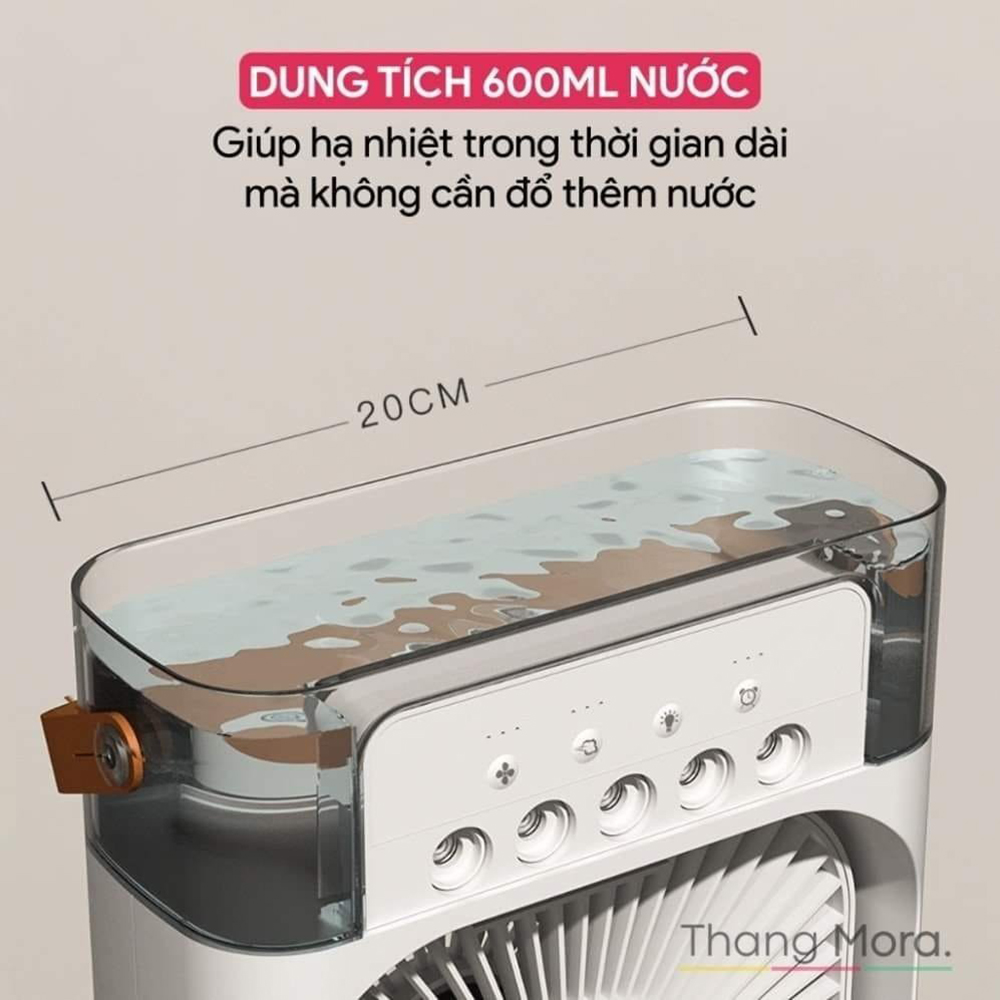 - Trọng lượng: 850g (không có nước) Thông tin chi tiết: Máy điều hòa mini làm mát không khí nhập khẩu thiết kế sang trọng, đẹp mắt, thích hợp dùng cho gia đình, văn phòng, nhà hàng, … Đặc điểm nổi bật Quạt điều hoà hơi nước mini, Quạt hơi nước làm mát để bàn 3 chế độ gió dung tích bình chứa nước 600ml tích hợp đèn led Máy điều hòa mini làm mát không khí nhập khẩu với khả năng làm mát và giữ ẩm không khí, căn phòng của bạn sẽ luôn là một nơi lý tưởng để nghỉ ngơi, thư giãn. Có thiết kế hiện đại, trang nhã làm nổi bật thêm không gian căn phòng. Máy điều hòa mini làm mát không khí nhập khẩu là thiết bị làm mát không khí bay hơi cho phép bạn tạo ra khí hậu riêng của mình. Thiết kế nâng cấp có 5 lỗ thoát khí giúp tỏa hơi nước nhanh và mạnh, nhanh chóng giảm nhiệt mùa hè Có chế độ hẹn giờ thông minh: 1 tiếng, 2 tiếng, 3 tiếng giúp bạn yên tâm ngủ không lo cạn nước Quạt êm dịu và ánh sáng ban đêm nhẹ nhàng làm cho nó hoàn hảo để sử dụng suốt đêm để có một giấc ngủ thoải mái. Đèn trạng thái LED tích hợp có thể được đặt thành bất kỳ tùy chọn 7 màu nào của nó, được đặt ở chế độ chu trình màu hoặc tắt bằng cách chạm vào nút Ưu điểm sản phẩm Quạt điều hoà hơi nước mini, Quạt hơi nước làm mát để bàn 3 chế độ gió dung tích bình chứa nước 600ml tích hợp đèn ledLàm mát cực nhanh bằng công nghệ ion không khí tiên tiến. Tạo độ ẩm, không làm khô da. Có chức năng lọc không khí. Tiết kiệm điện năng. Hoạt động bền bỉ, không có tiếng ồn. Có đèn LED điều chỉnh được 7 màu sắc khác nhau làm đèn ngủ. Quạt làm mát không khí có 3 chế độ tốc độ gió (Thấp / Trung bình / Cao) và 3 chế độ phun