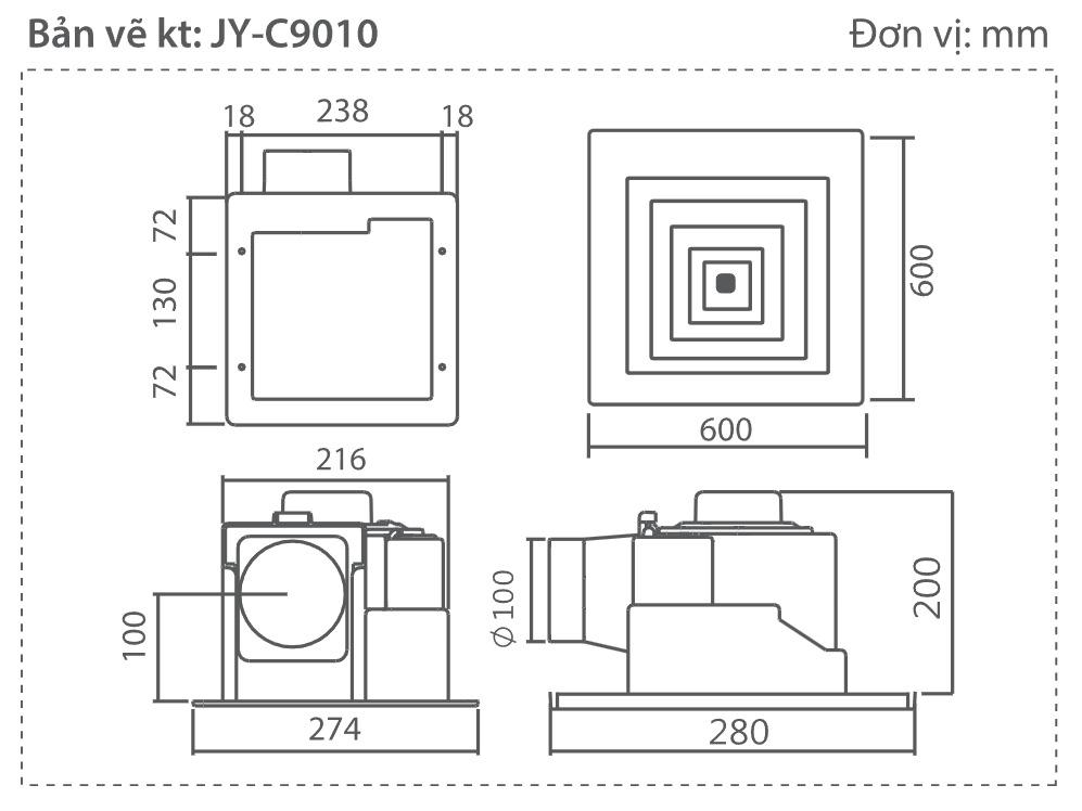 Quạt thông gió JY-C9010 được thiết kế lắp đặt âm trần, mặt nạ nằm ngoài làm cho không gian căn phòng của bạn trở nên sang trọng hơn. Phù hợp lắp đặt cho căn hộ, nhà hàng, quán ăn, văn phòng, hội trường,...