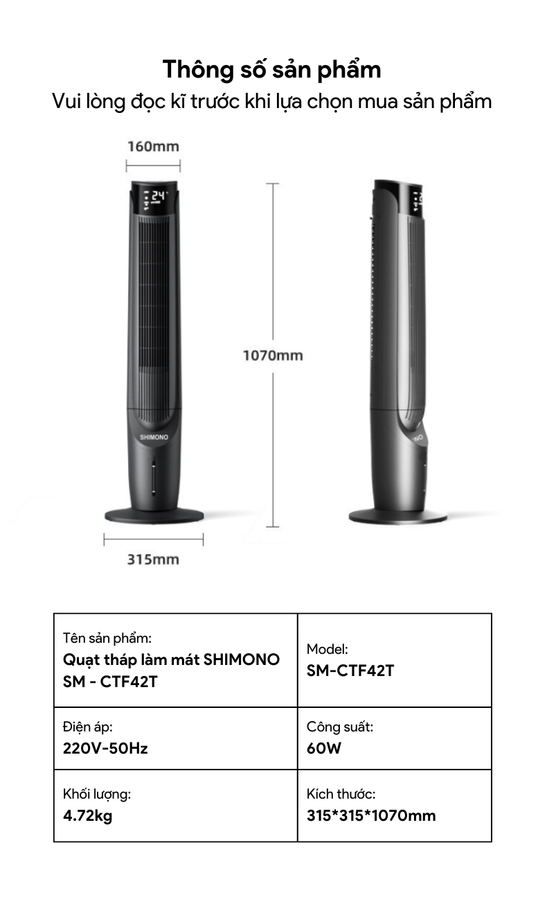QUẠT THÁP LÀM MÁT THÔNG MINH SHIMONO | SM - CTF42B | Thiết kế thông minh, tiện ích vượt trội