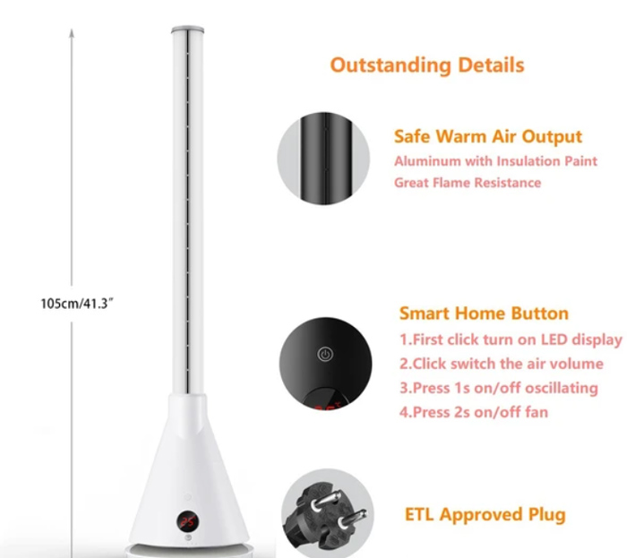- Tản nhiệt nhanh hơn – Công suất làm nóng 2000W với 4 mức năng lượng điều tiết – Công tắc bật/tắt tự động: Ultty cho phép cài đặt nhiệt độ từ 1 đến 30°C. Nếu nhiệt độ cài đặt cao hơn nhiệt độ môi trường, chức năng sưởi sẽ tự động bật. Ngược lại, nếu đặt nhiệt độ thấp hơn nhiệt độ môi trường, quạt sẽ tắt chức năng sưởi. Thiết kế hiện đại, tinh tế – Thiết kế hình tháp độc đáo, sang trọng và tinh tế – Chiều cao 101cm cùng đường kính chân đế 23,5cm cho phép bạn dễ dàng di chuyển quạt từ phòng này sang phòng khác, tiết kiệm diện tích, phù hợp cho nhiều không gian – Thân ống làm bằng hợp kim nhôm đúc, không chỉ sang trọng, hiện đại mà còn sở hữu độ bền cao, không biến dạng trong quá trình sử dụng – Thiết kế thông minh tạo luồng gió thẳng, không gấp khúc, giúp tăng hiệu suất gió và tiết kiệm điện năng. An toàn cho người sử dụng, kể cả trẻ sơ sinh – Quạt không cánh sử dụng an toàn. – Ngừng hoạt động ngay khi có hiện tượng nghiêng đổ – Tính năng bảo vệ khi quá nhiệt – Luồng gió đối lưu phân tán rộng, 100% thân thiện với trẻ sơ sinh. Vận hành êm ái – Quạt tháp Ultty hầu như không gây tiếng ồn khi hoạt động nhờ 4 lớp tiêu âm: đế tiêu âm, buồng cách âm, vòng giảm thanh và lớp vật liệu cách âm mang đến cho gia đình bạn giấc ngủ thật sảng khoải Các tính năng hiện đại khác – Điều khiển từ xa bằng công nghệ bluetooth, kết hợp với nút bấm cảm ứng trên thân robot và điều khiển từ xa 15m – Hẹn giờ: 1-8h