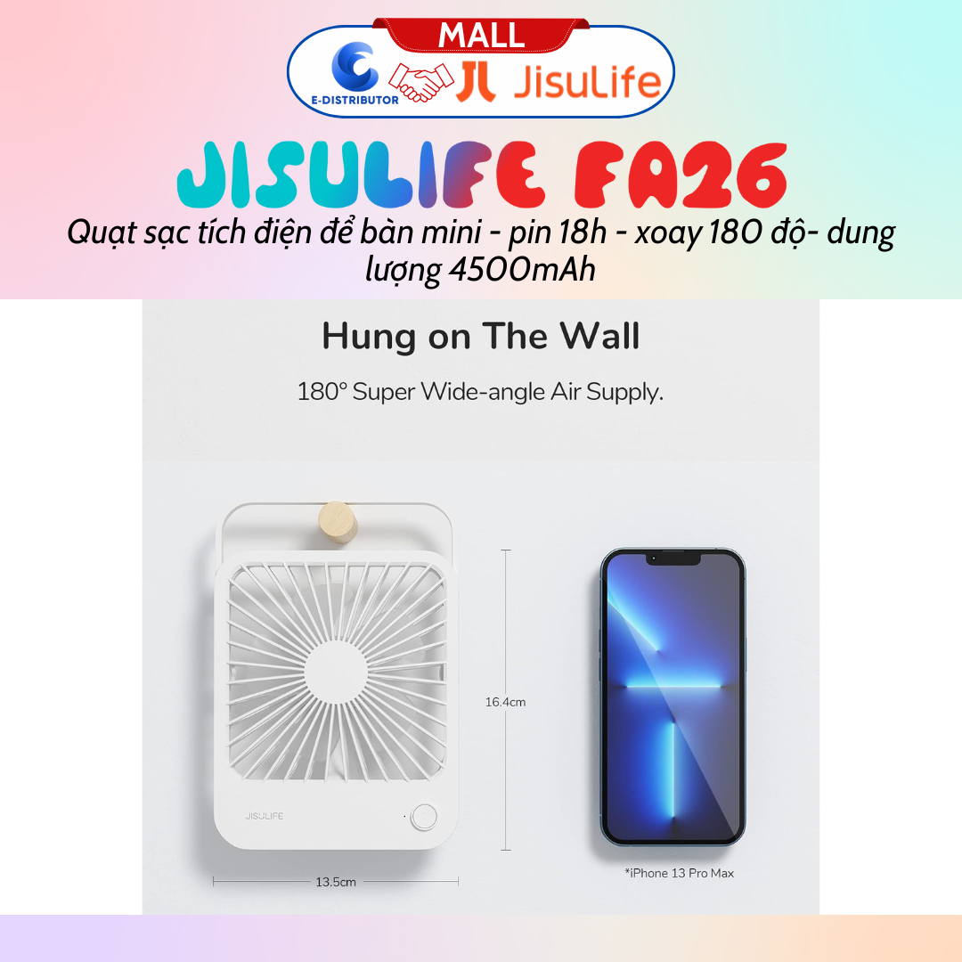 - Quạt mini gấp gọn 180° Jisulife FA26 có chân đế có thể gập xoay 180 độ, có thể đứng hoặc treo. Thiết kế góc rộng tập trung sức gió từ mọi hướng, tạo ra luồng gió tốc độ cao.