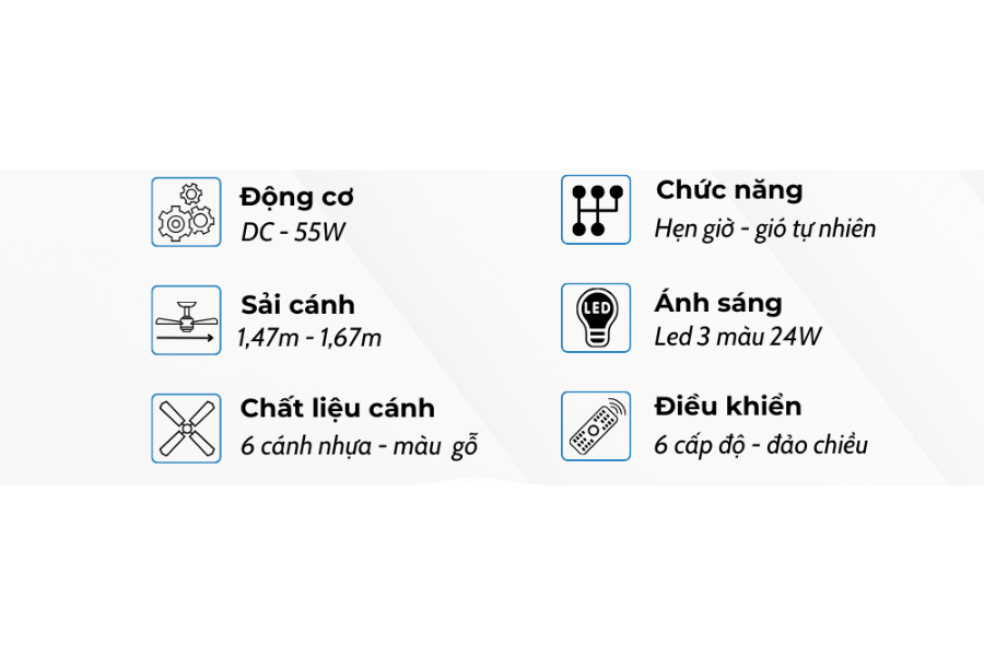 - 6 Cánh nhựa – Sải cánh 1,47/1,67m tạo luồng gió đều, mạnh