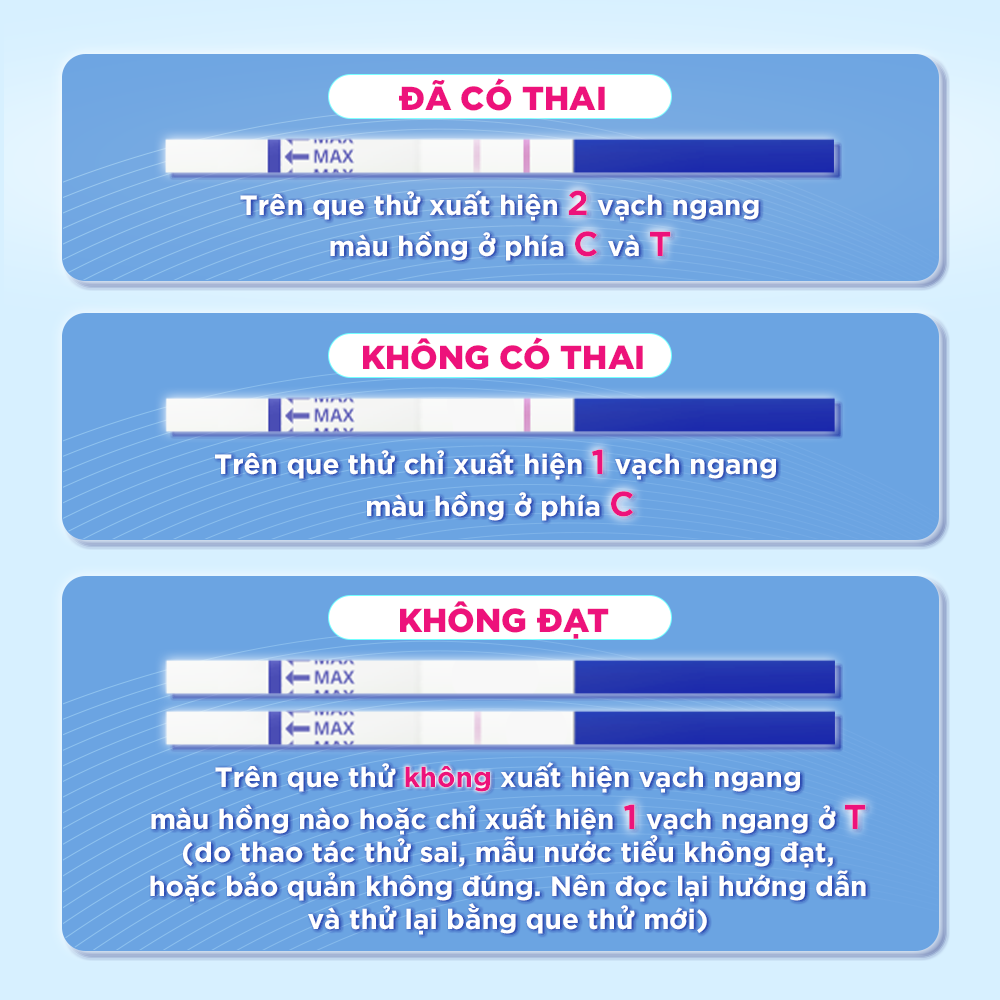 - KHÔNG ĐẠT: Trên que thử không xuất hiện vạch ngang màu hồng nào hoặc chỉ xuất hiện vạch ngan ở T (do thao tác thử sai, mẫu nước tiểu không đạt, hoặc bảo quản không đúng. Nên đọc lại hướng dẫn và thử lại bằng que thử mới. LƯU Ý