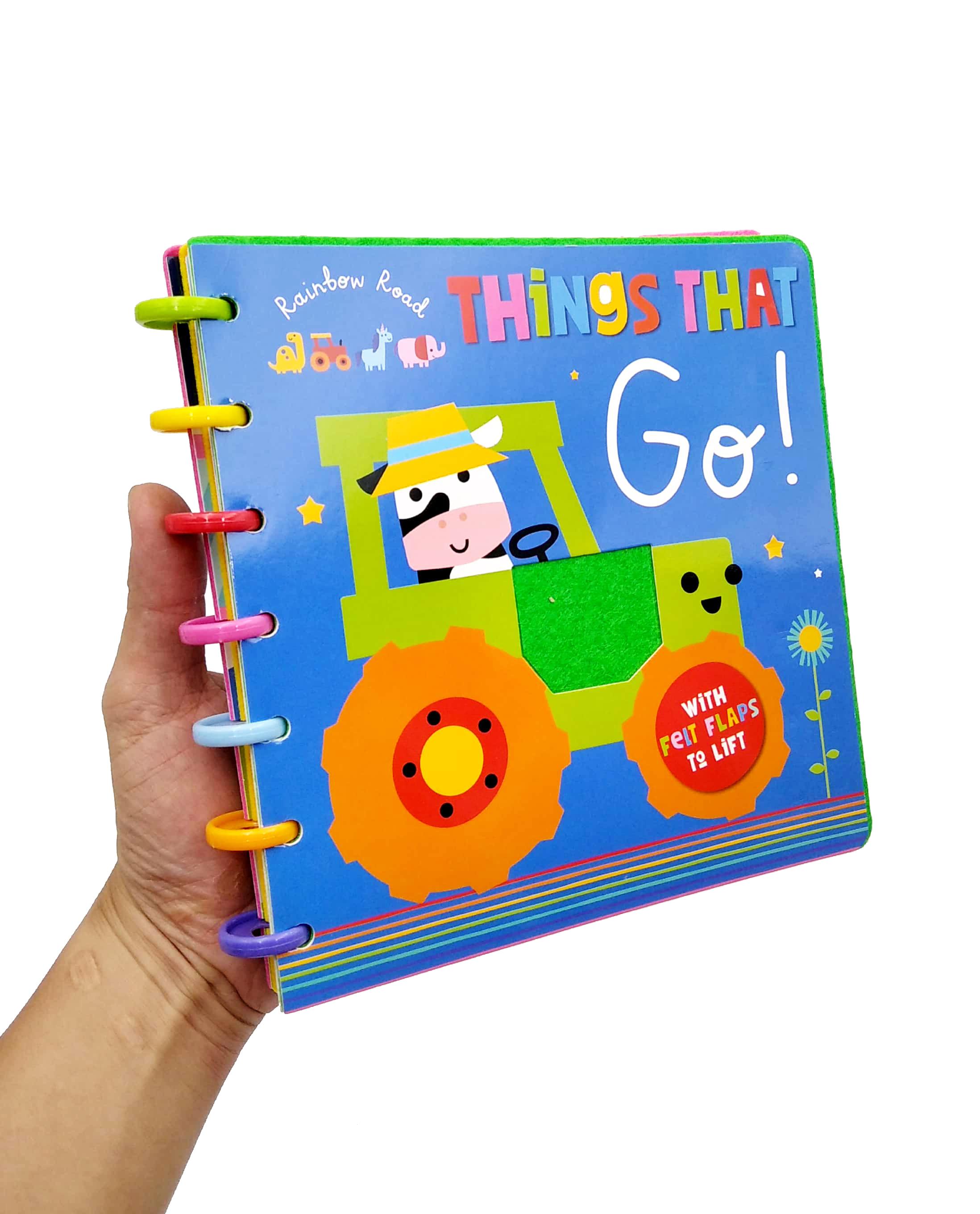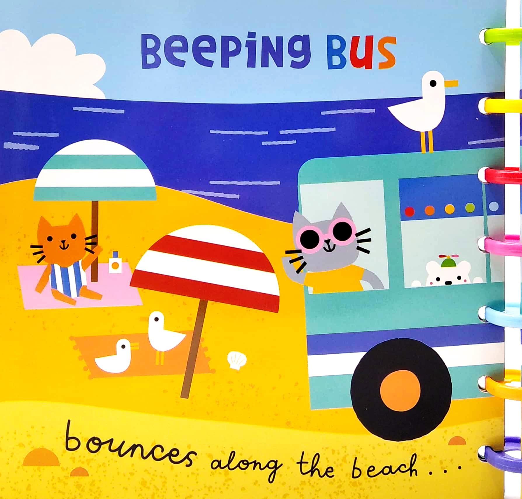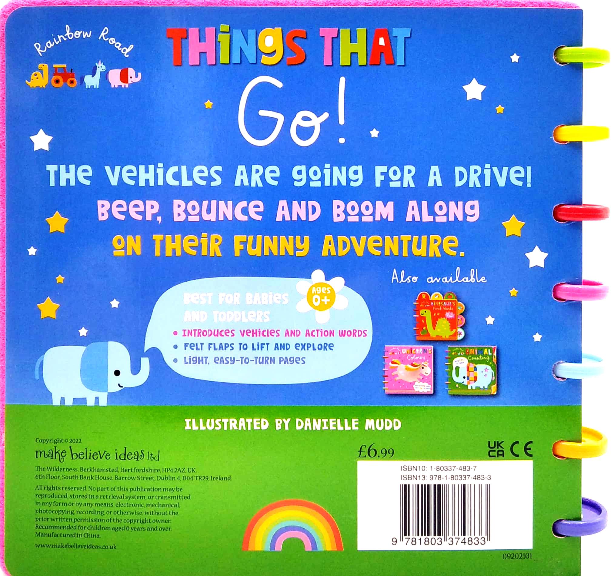 This sweet book teaches children first vehicle words! The book uses fun, simple language and bright illustrations to engage little ones. Rainbow-coloured plastic loops hold the pages together, creating a tactile and durable spine that is great for young children to explore with their hands. VEHICLE WORDS BOOK WITH PLASTIC LOOPS ON SPINE